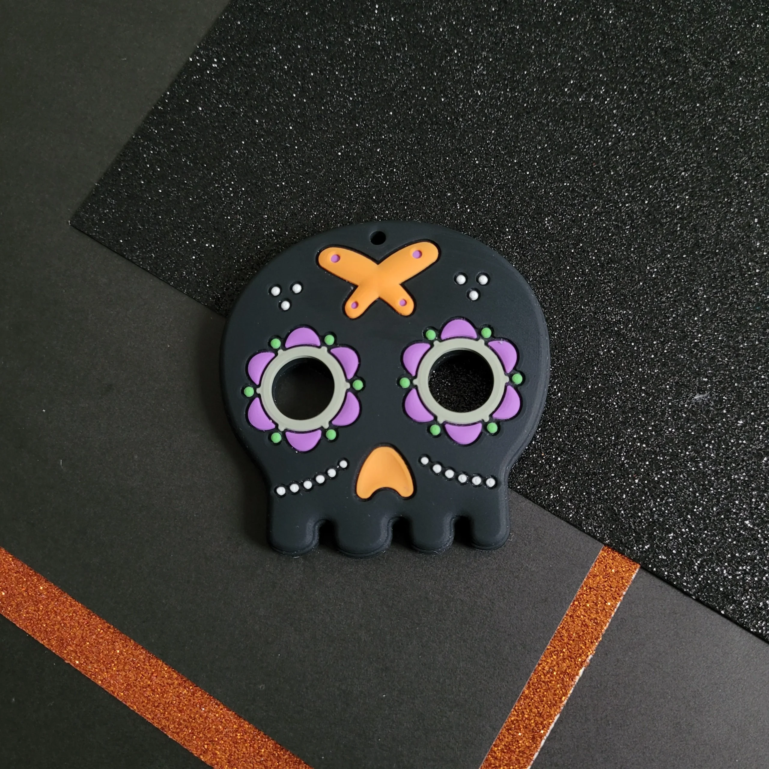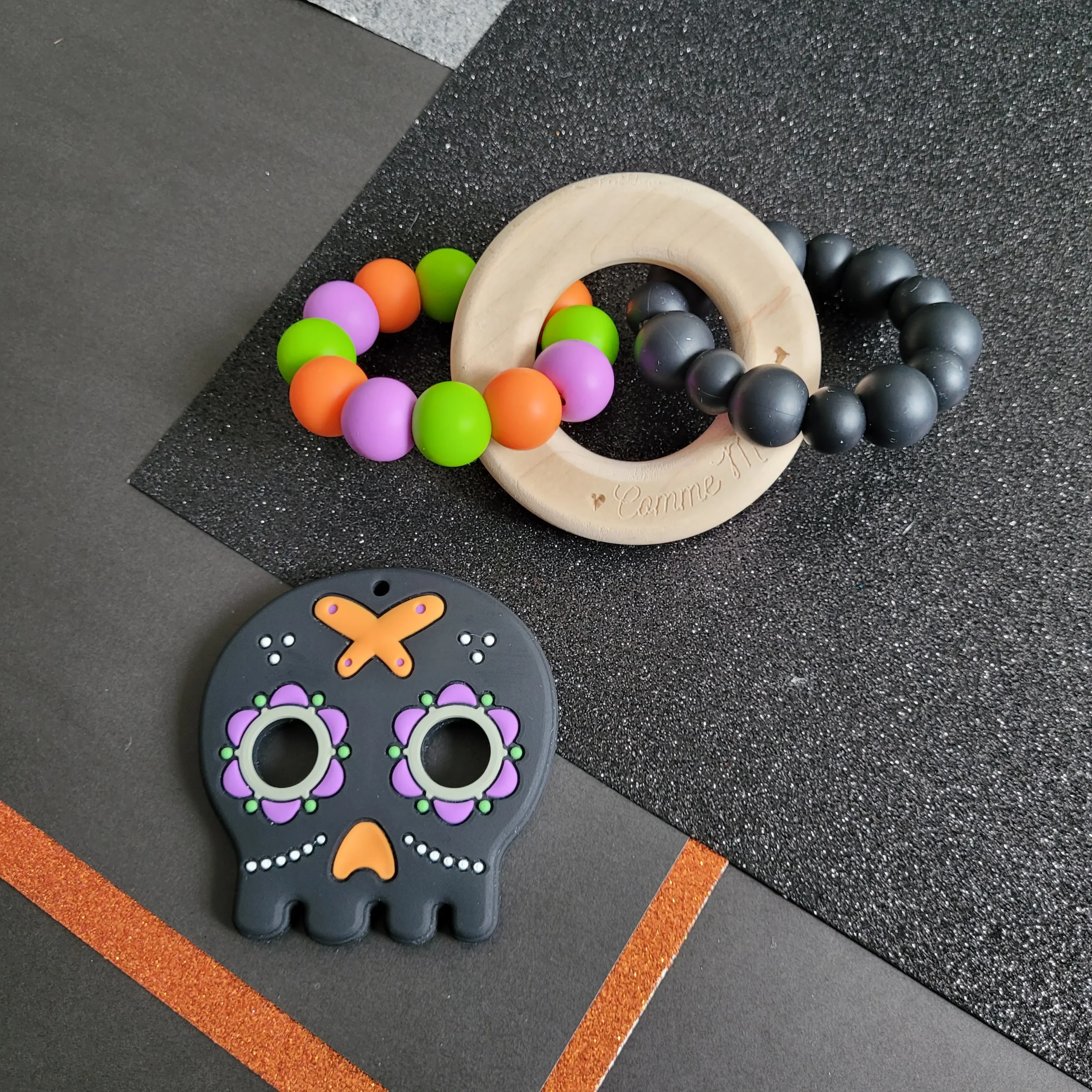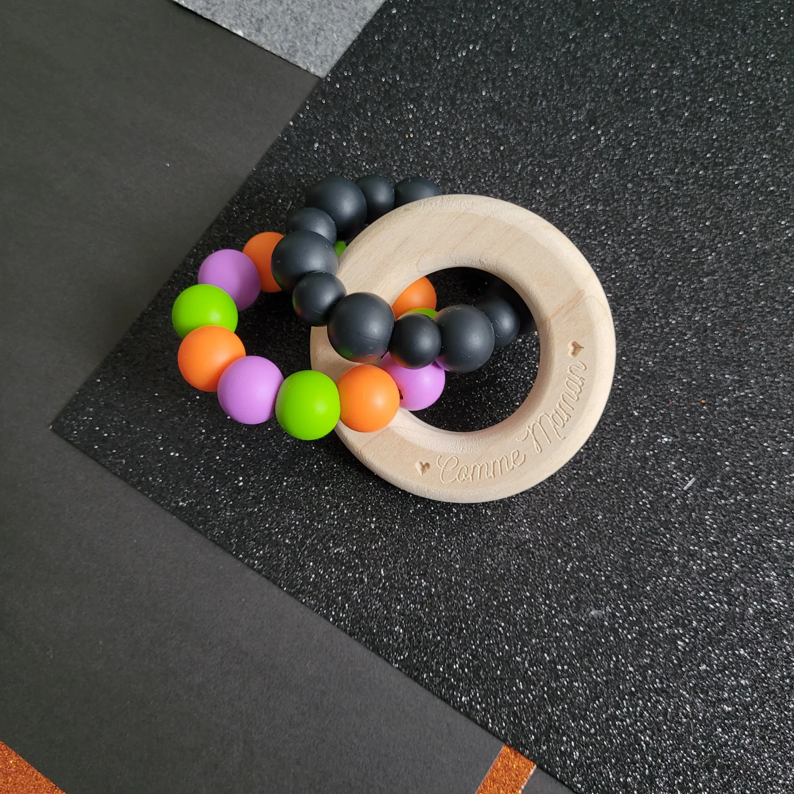 Anneau de dentition HALLOWEEN, modèle ARTHUR, perles de silicone, érable canadien, poussée dentaire, cadeau shower, cadeau de naissance