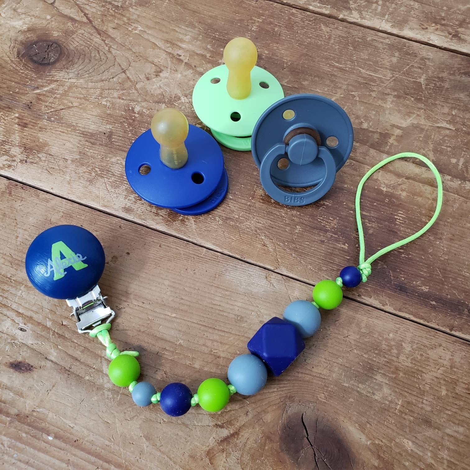 Les pinces des attache-suces sont en bois et peintes à la main avec une peinture acrylique et un vernis à l’eau non-toxique. Les couleurs peuvent variées légèrement d’une attache à l’autre, ou peux différer de la photo. Il est possible de les personnaliser, avec le prénom de votre enfant.
