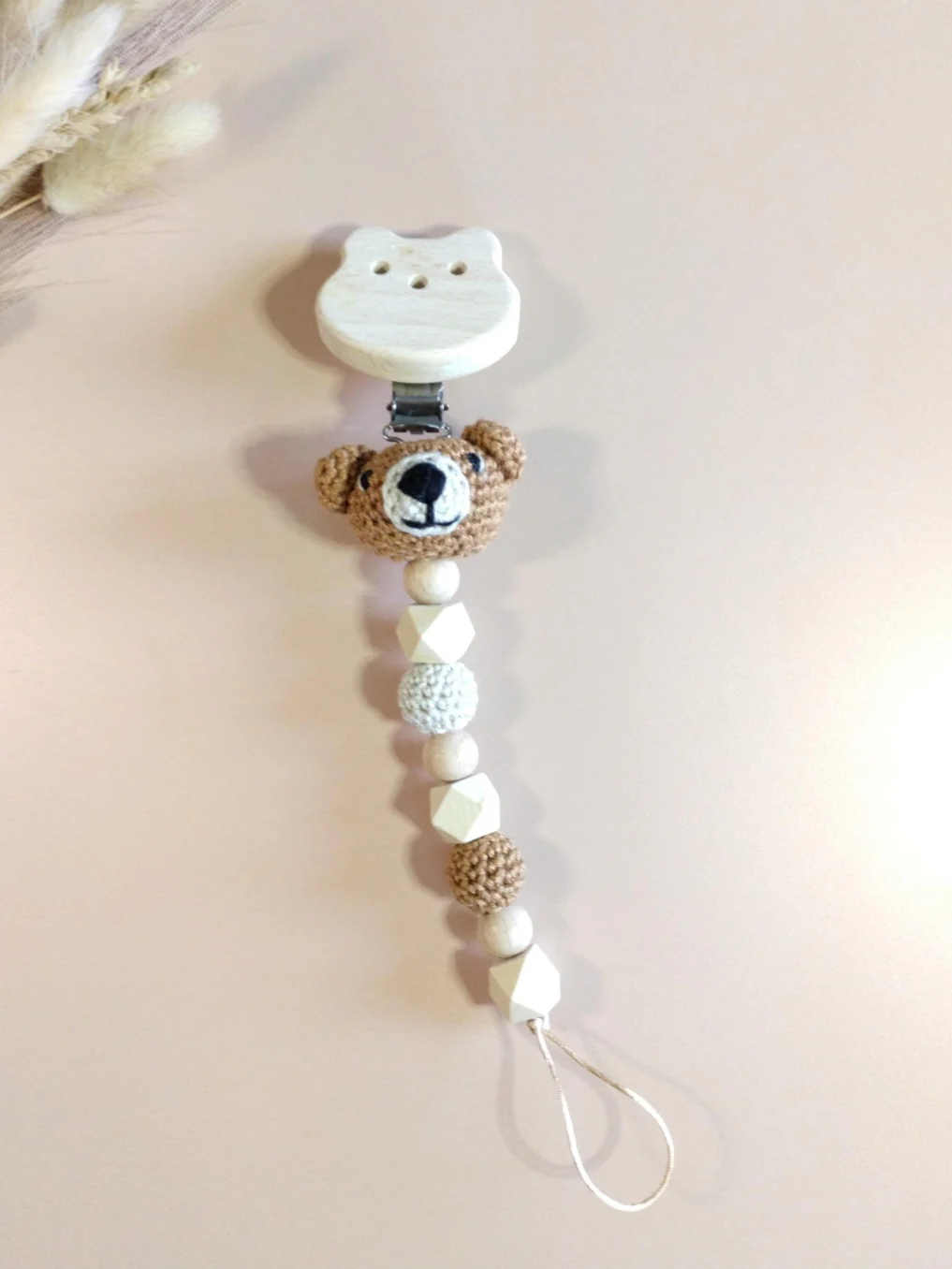Et l’attache tétine est idéal pour ne pas perdre l’indispensable tétine. Elle mesure 22cm pour respecter les normes CE. Réaliser à la main avec des perles en bois et en crochet (coton).