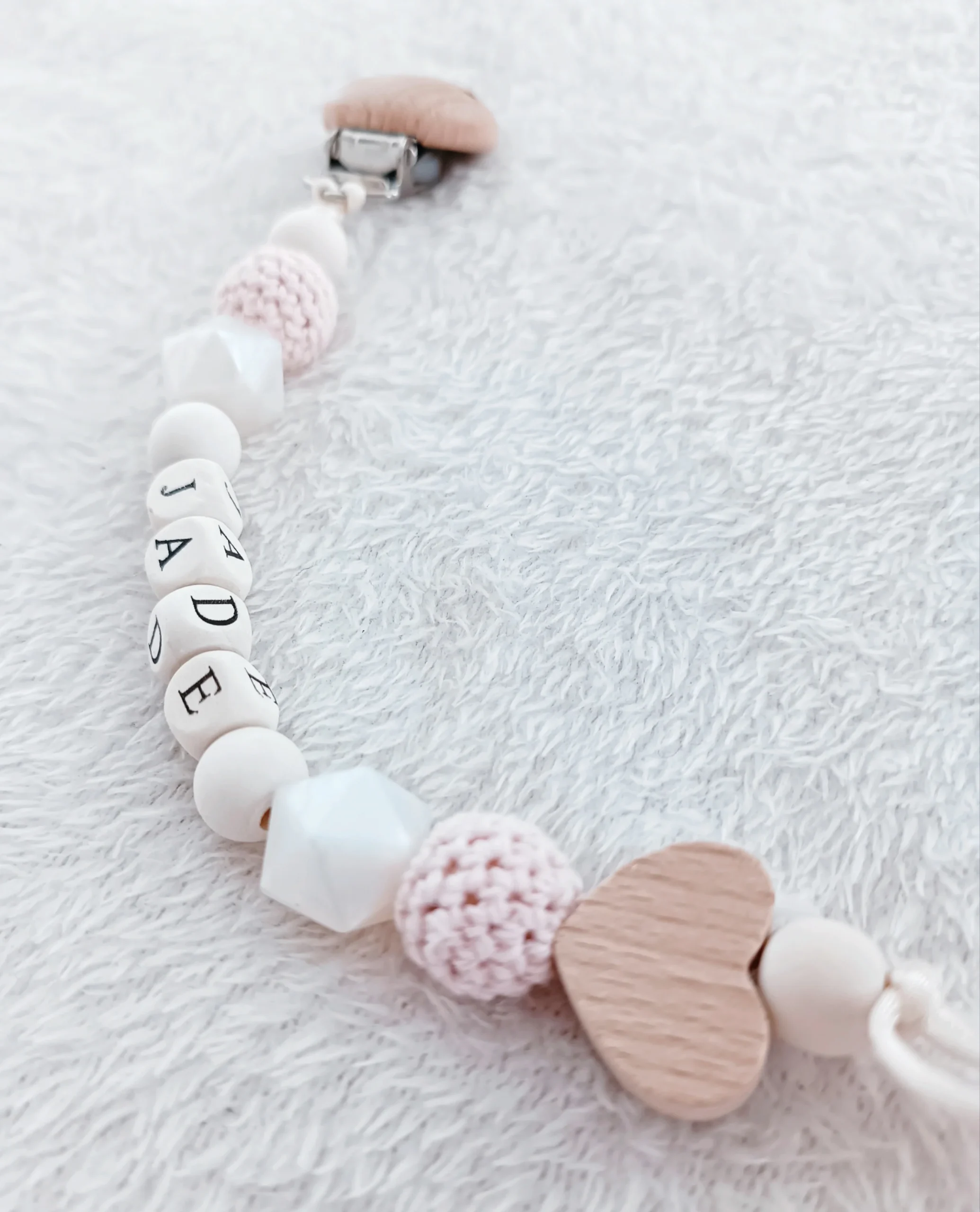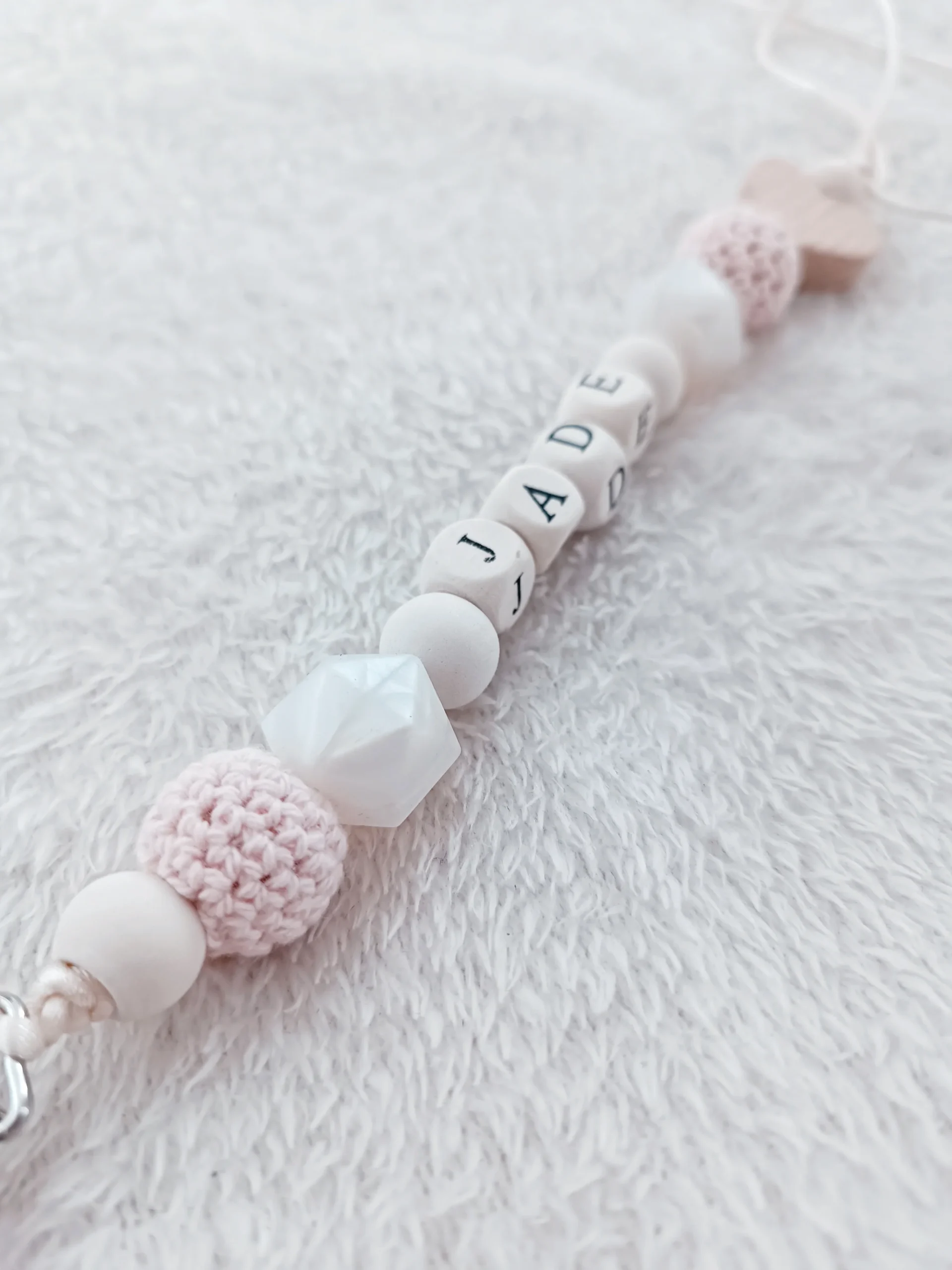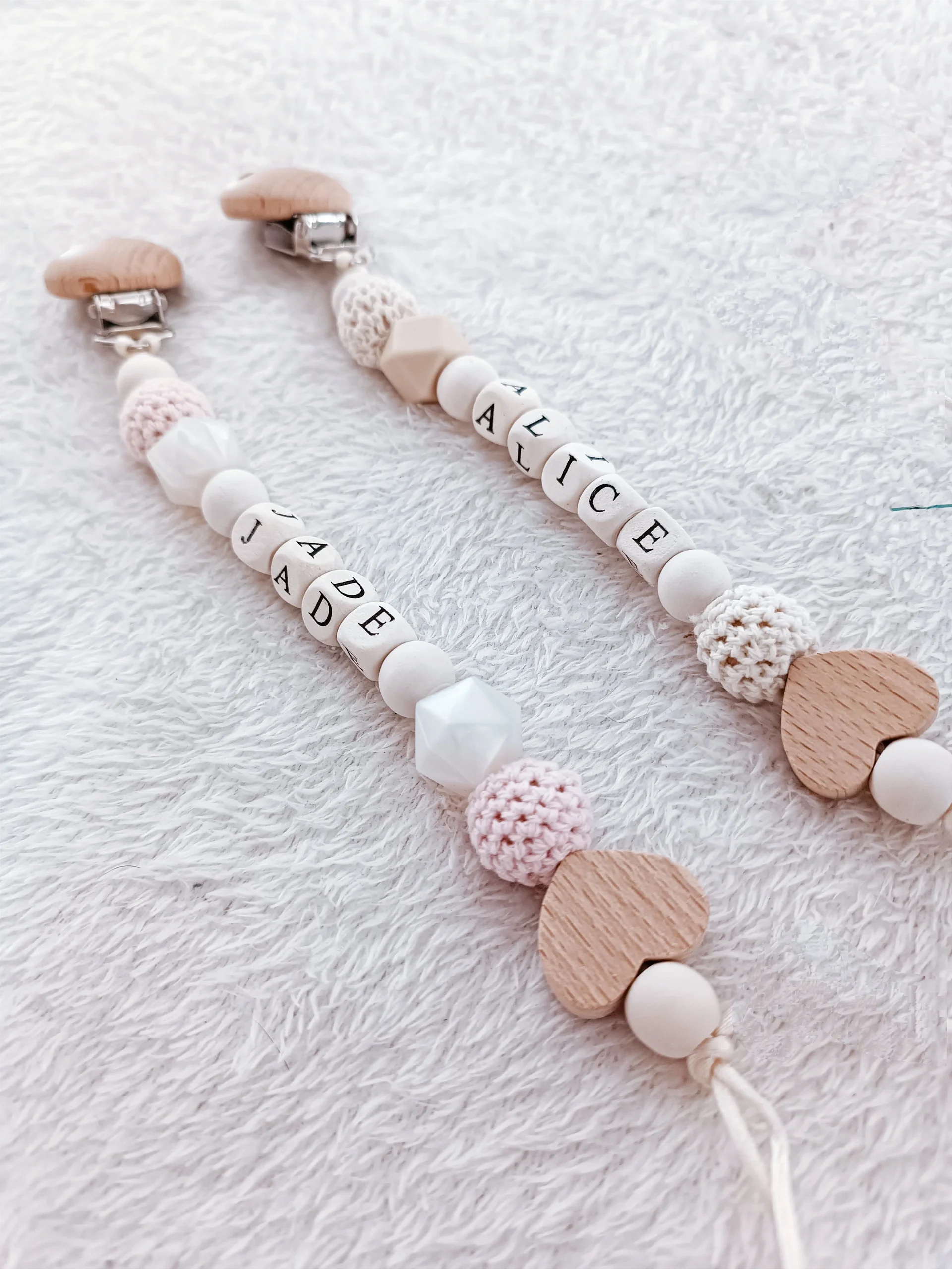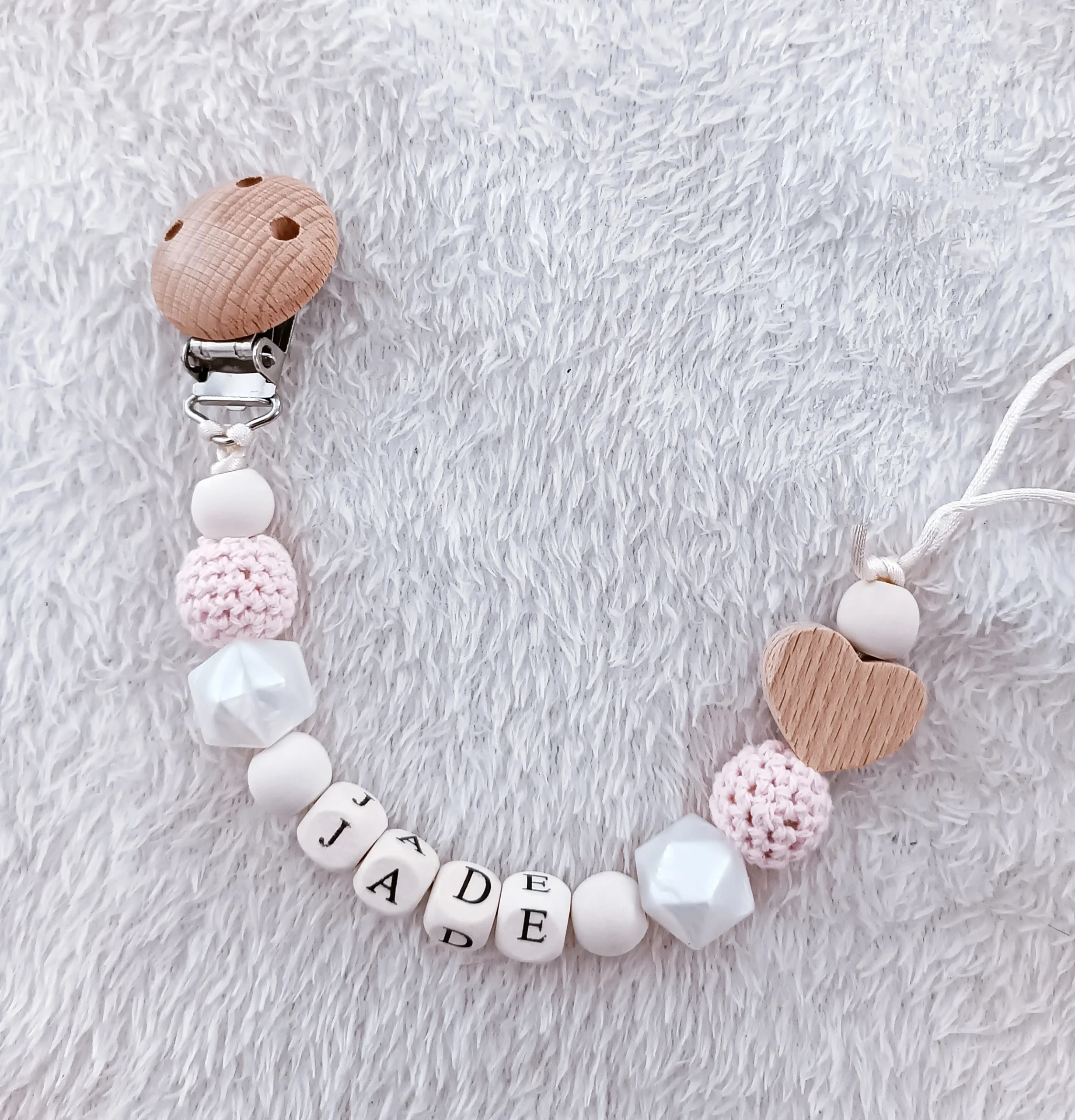 1er modèle girly 🌸 plongez dans la coquetterie avec ce modèle composé de deux perles en crochet rose clair et deux perles en silicones blanches nacrées agrémenté d’une belle perle en bois brut en forme de coeur