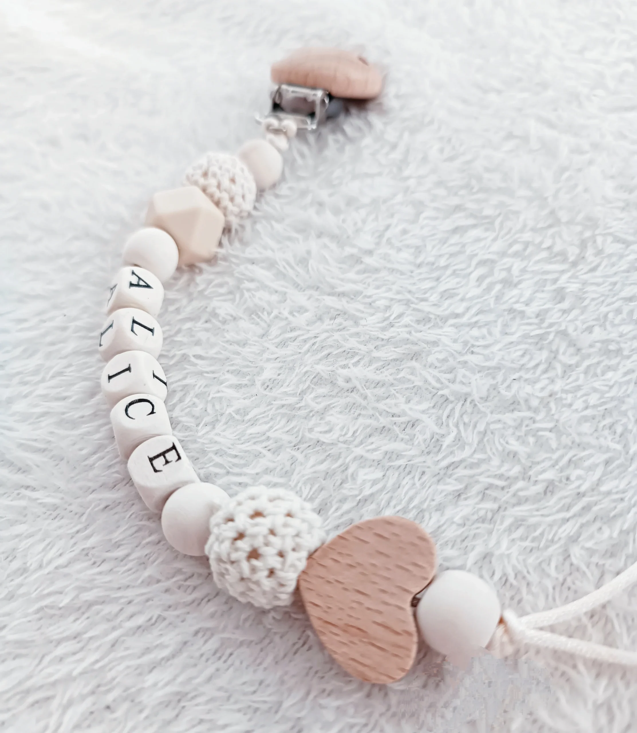 Chères parents, allégez votre charge mental en ayant toujours à porté de mains la sucette de votre bébé ! Accessoire indispensable pour vous faciliter le quotidien. Attache tétine personnalisé en bois1er modèle girly 🌸 plongez dans la coquetterie avec ce modèle composé de deux perles en crochet rose clair et deux perles en silicones blanches […]