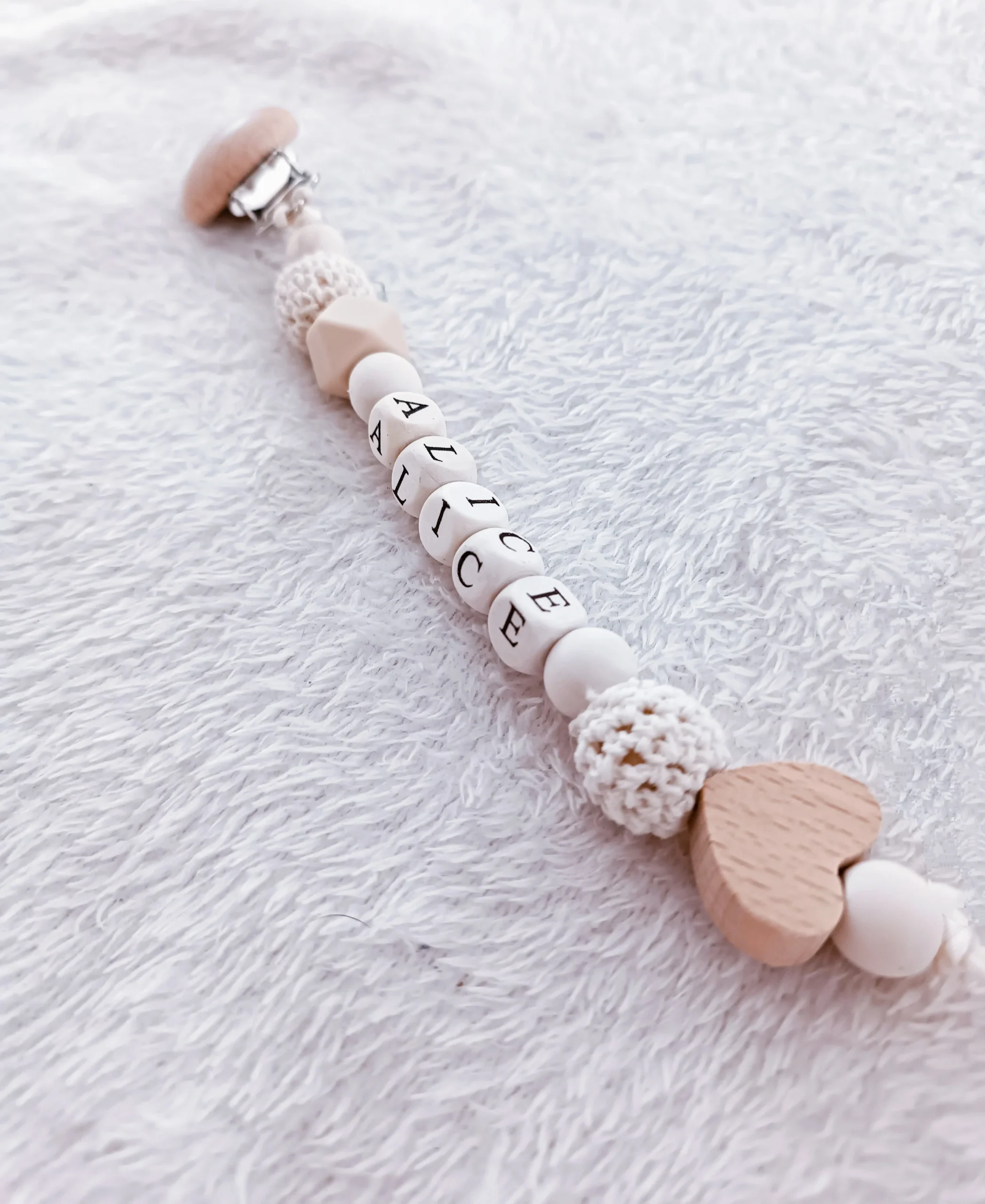 Plongez dans un monde de douceur avec le 2 ème modèle : composé de deux perles en crochet écru et d’une perle en silicone beige agrémenté d’une belle perle en bois brut en forme de coeur