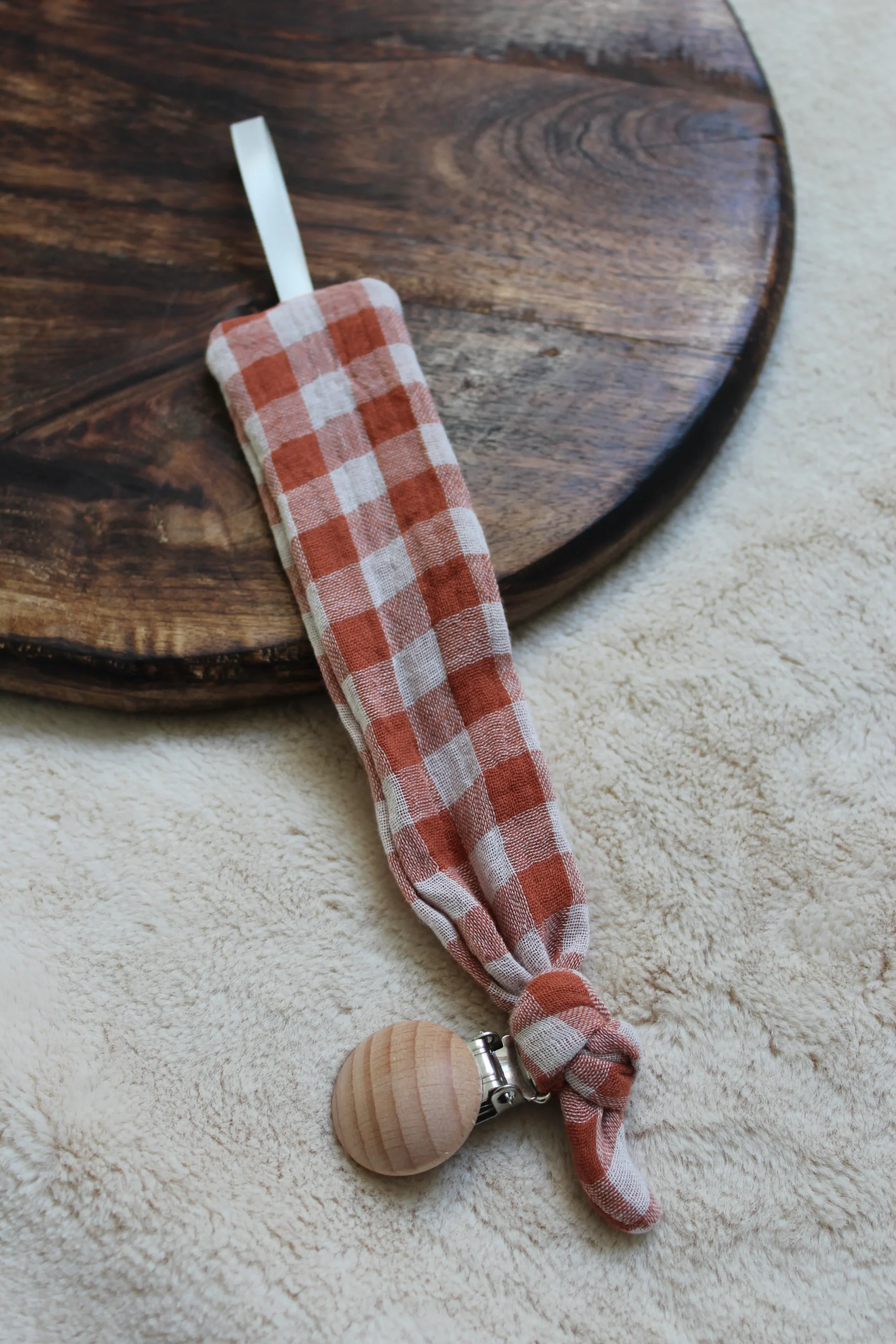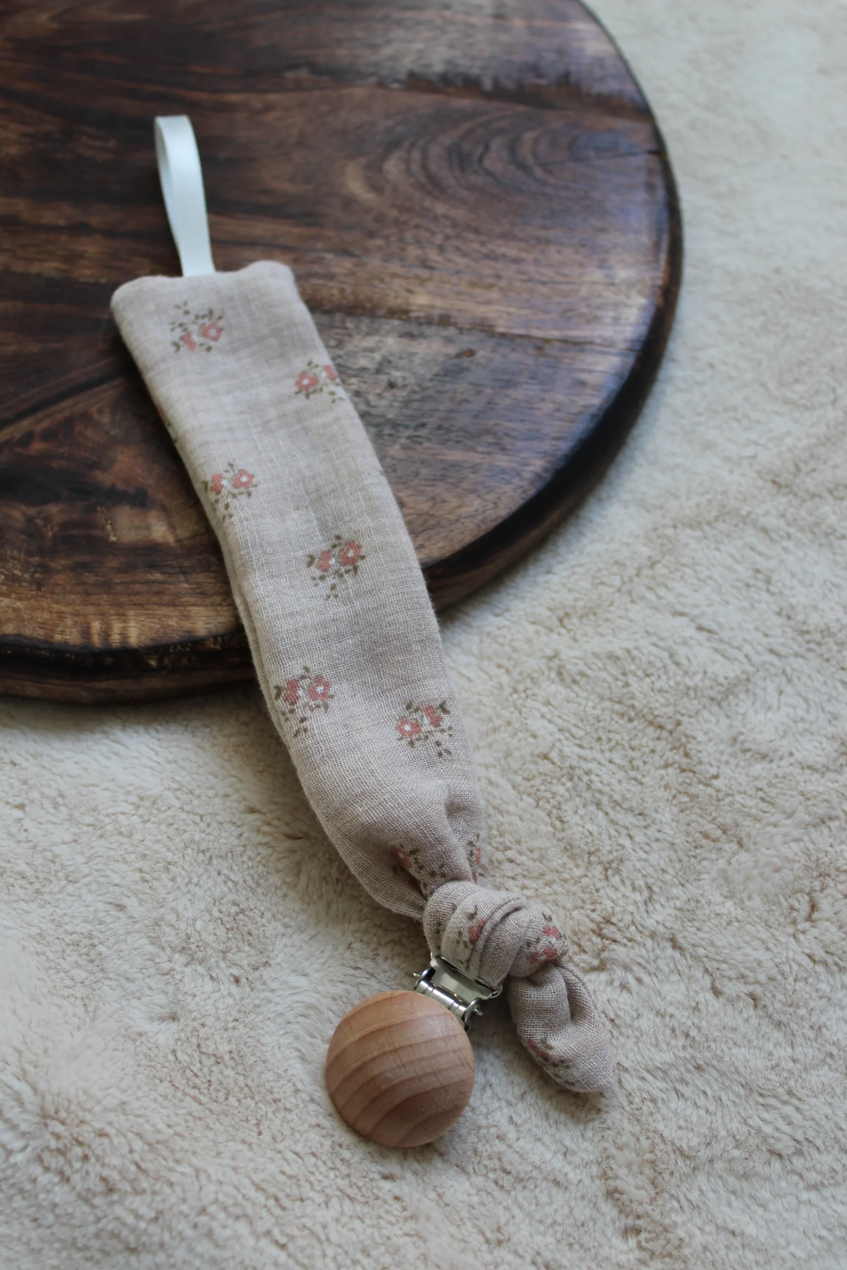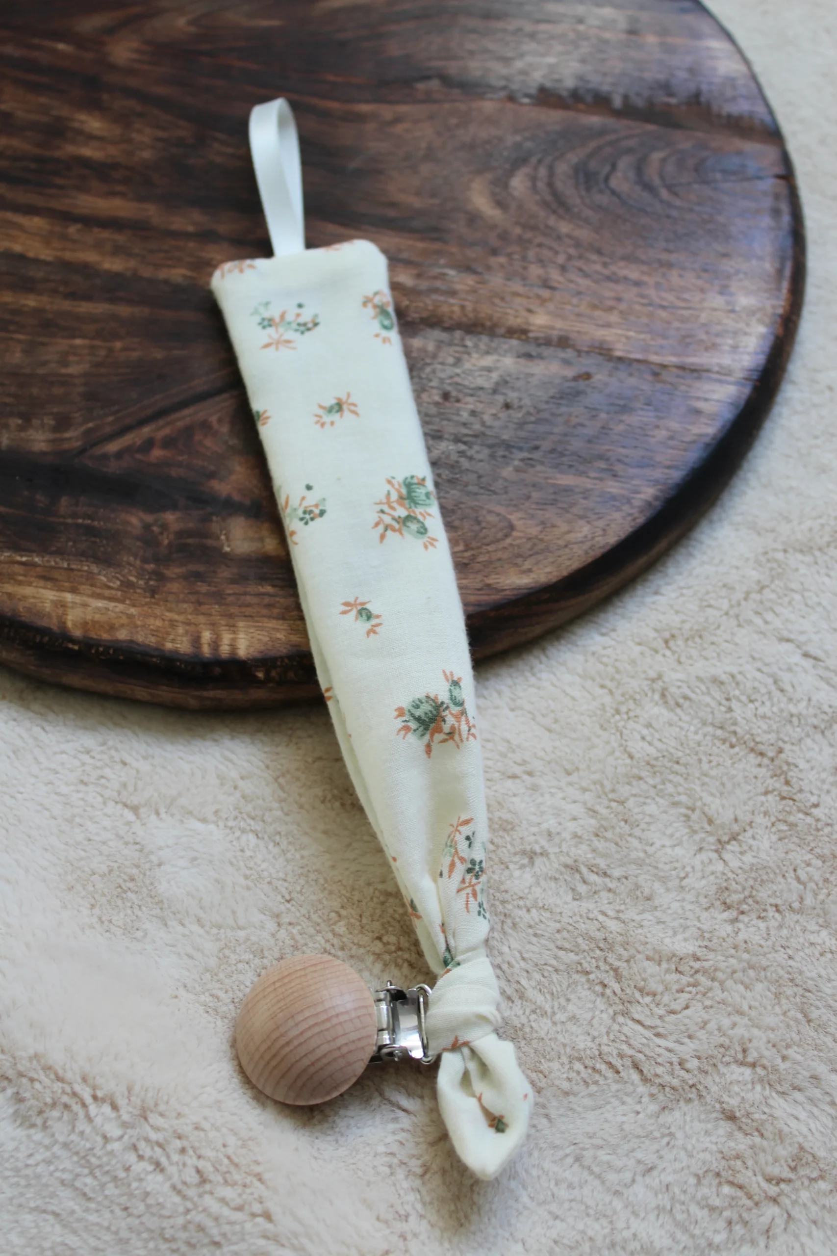 La pince en bois permet d’accrocher l’attache à un vêtement, une couverture et le ruban permet d’accrocher la tétine.