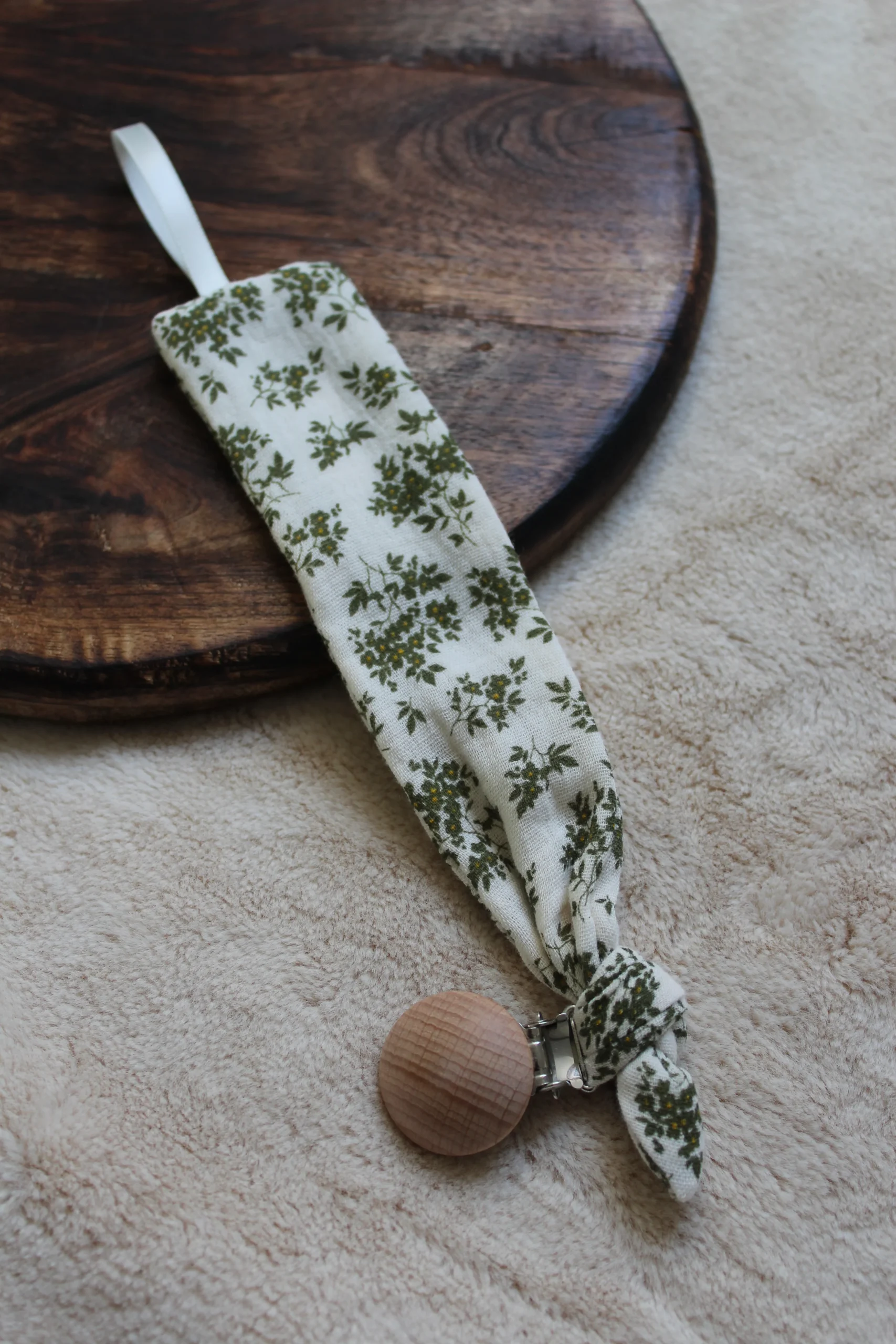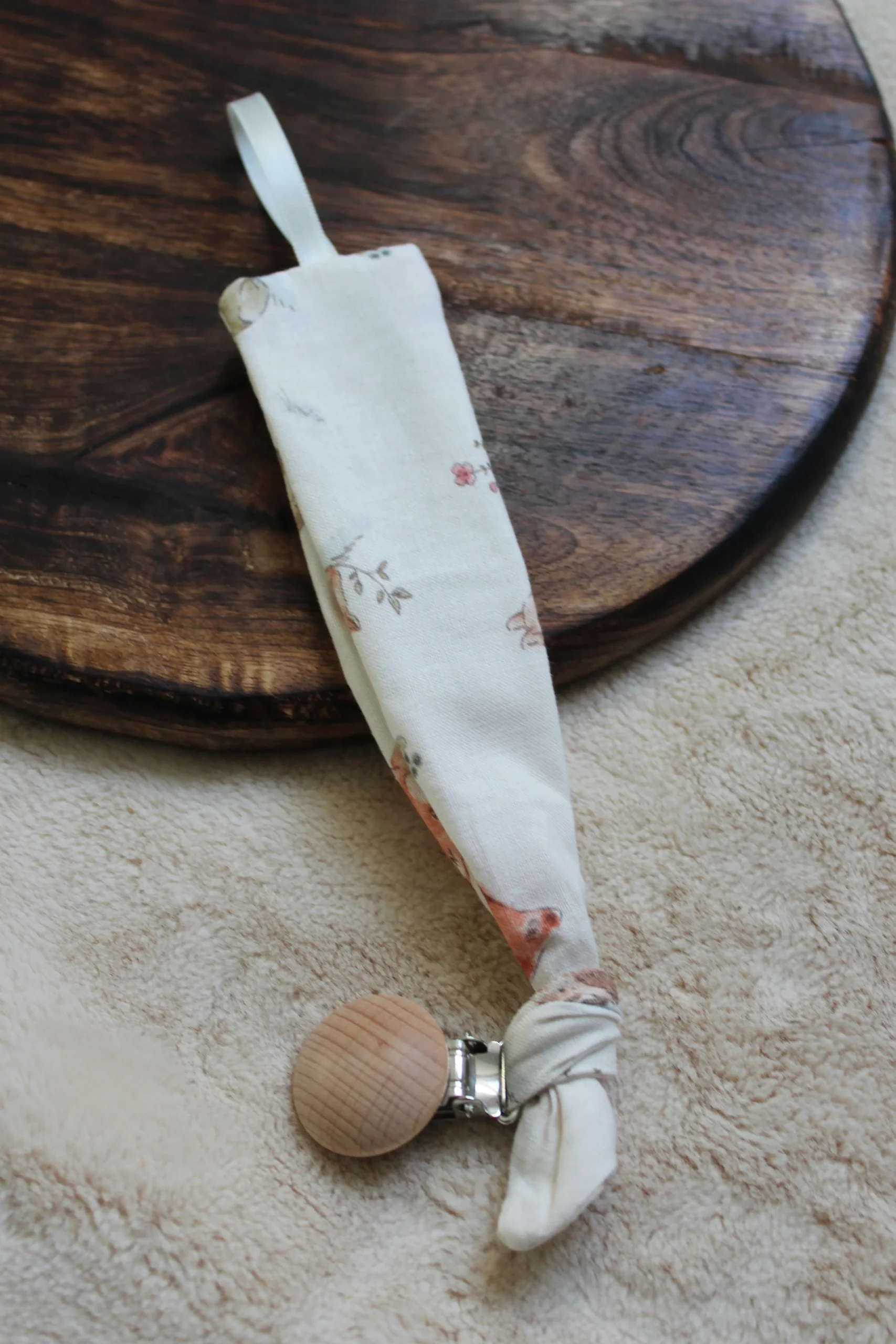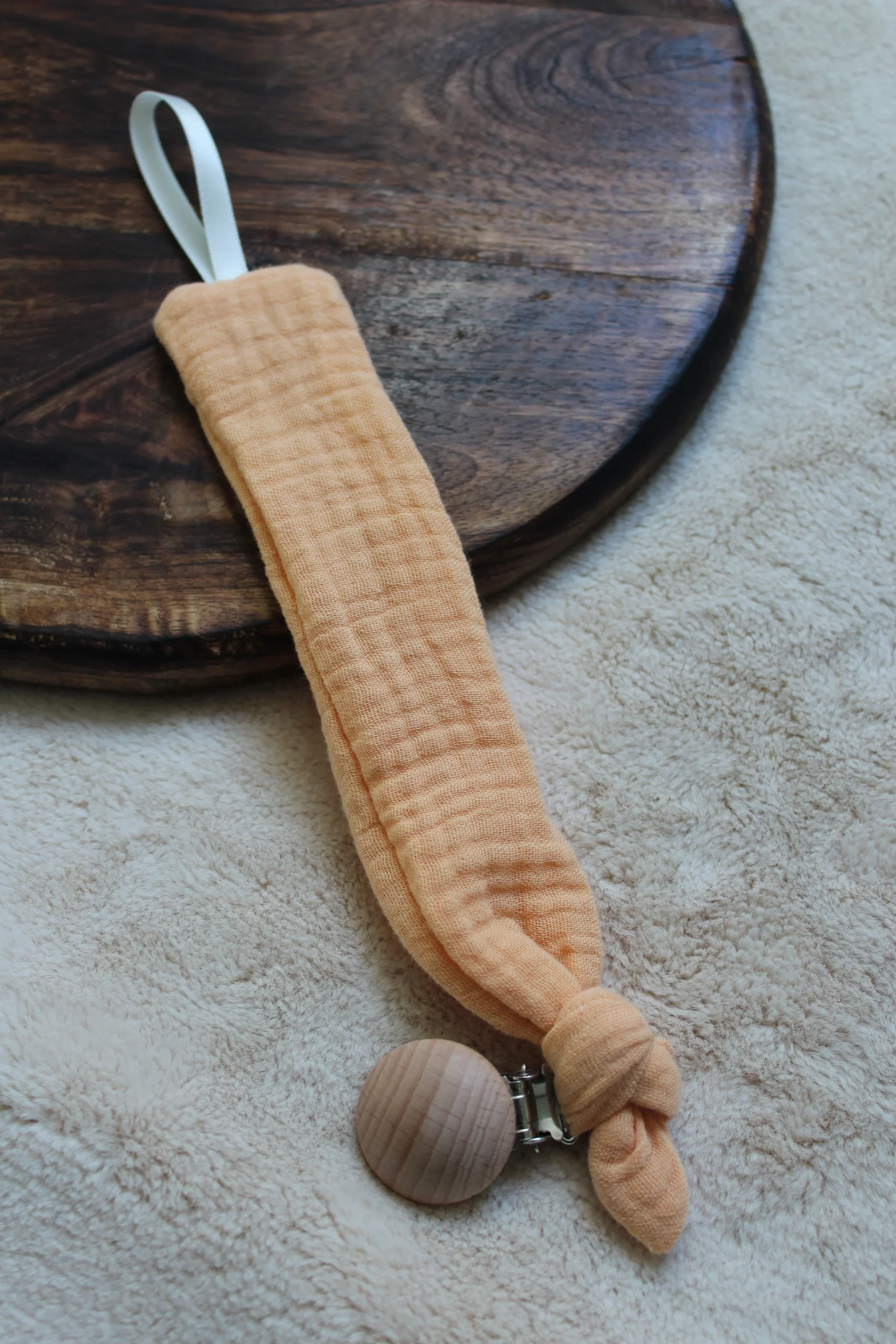La pince en bois permet d’accrocher l’attache à un vêtement, une couverture et le ruban permet d’accrocher la tétine.