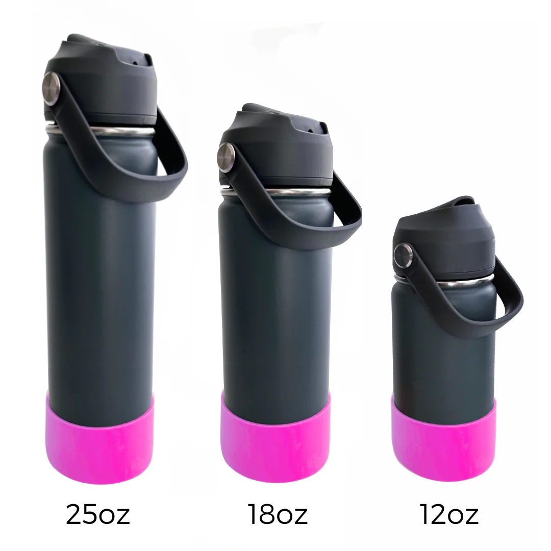 Elles sont recouvertes d’une botte en silicone offerte en 8 couleurs différentes pour protégée la bouteille des chutes potentielles et pour diminuer le bruit de la bouteille lorsqu’elle est déposé sur un bureau de classe.