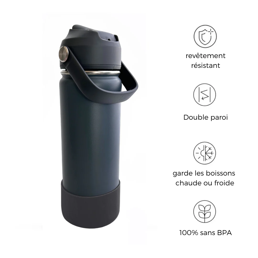 Elles sont recouvertes d’une botte en silicone offerte en 8 couleurs différentes pour protégée la bouteille des chutes potentielles et pour diminuer le bruit de la bouteille lorsqu’elle est déposé sur un bureau de classe.