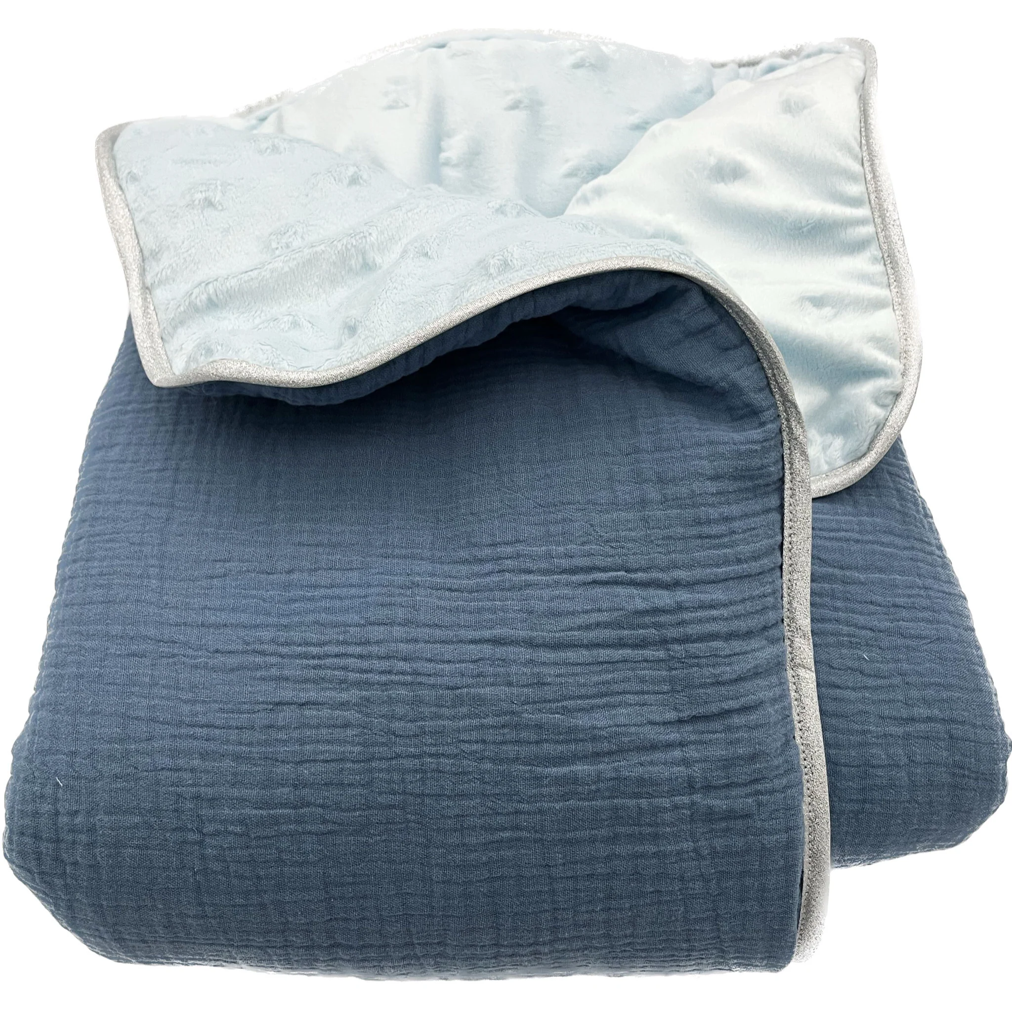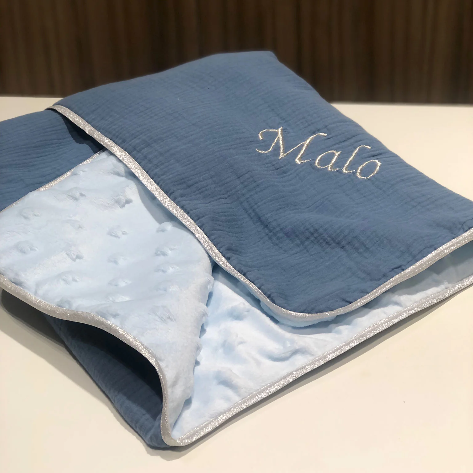 Couverture bébé personnalisée double gaze Bleu jean biais argent