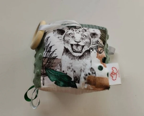 Les petites mains auront plaisir à découvrir toutes les facettes du cube qui présente des matières et des motifs différents ainsi que des activités tactiles et sonores grâce à son grelot, anneau de dentition en bois et les petites étiquettes.