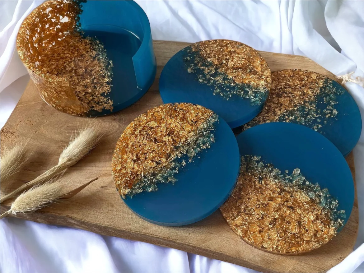 Dessous de verre en résine époxy.Plusieurs couleurs disponibles 6 pièces + son socle Idéal pour une idée cadeau, un anniversaire, une fête, noël ou pour soi même. Les dessous de verre sont un cadeau original.