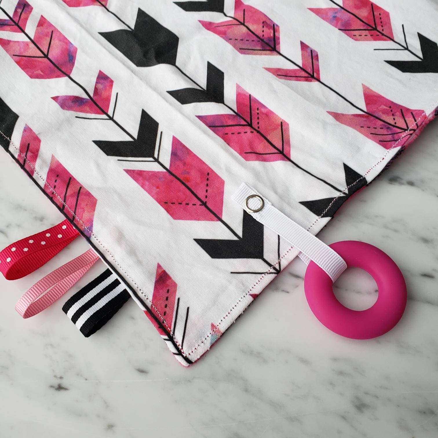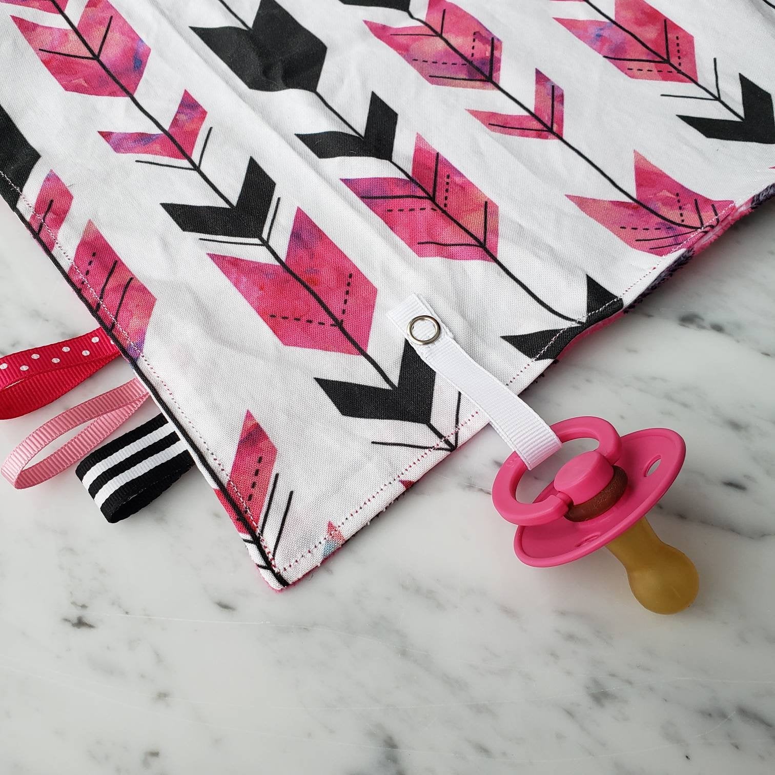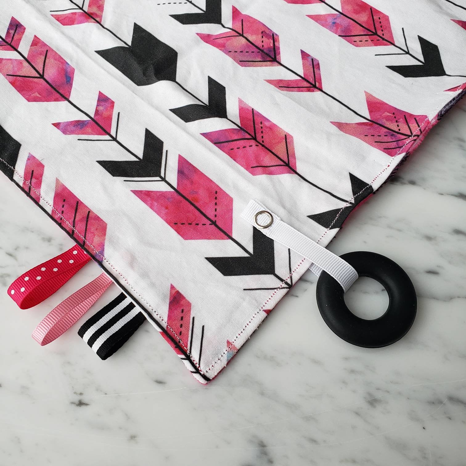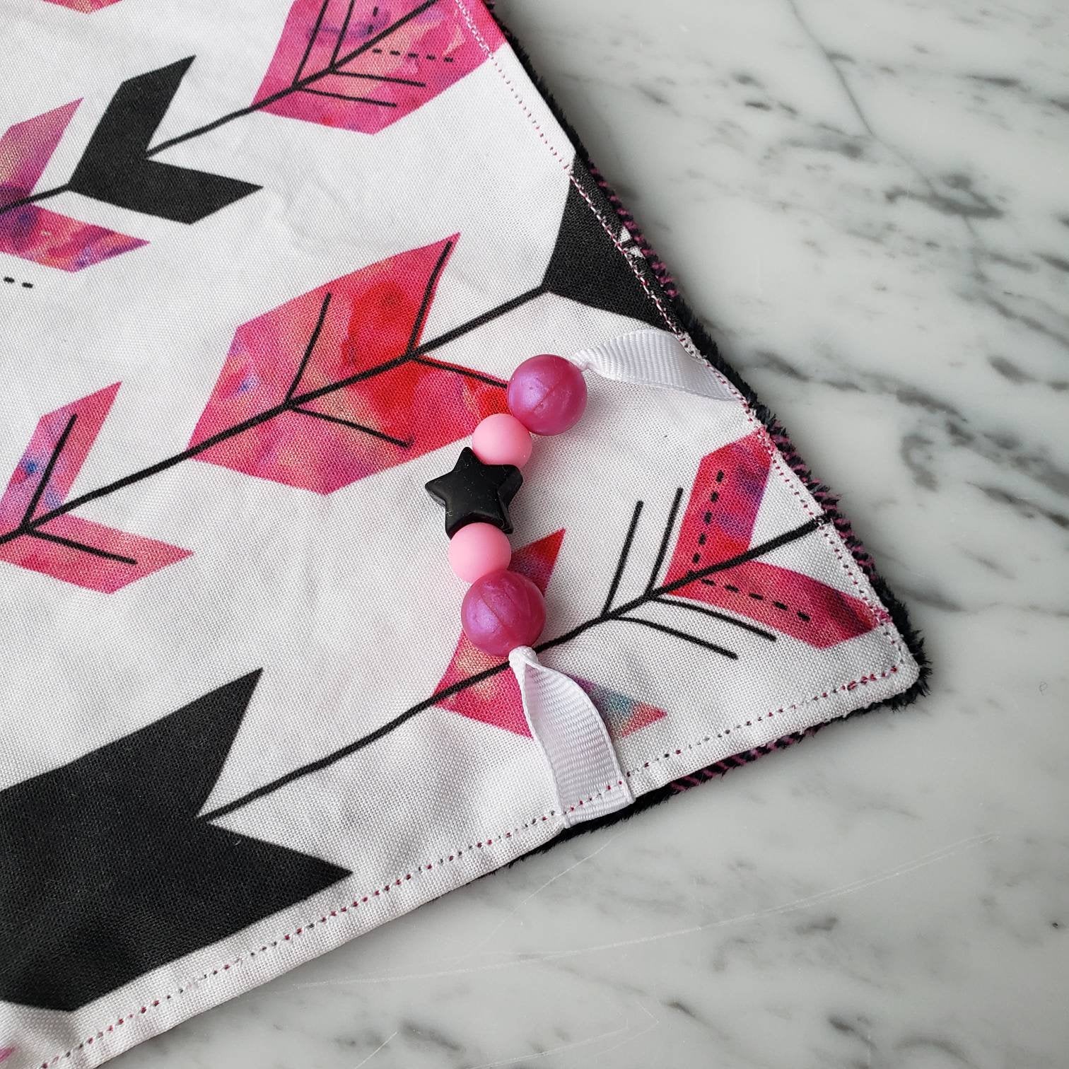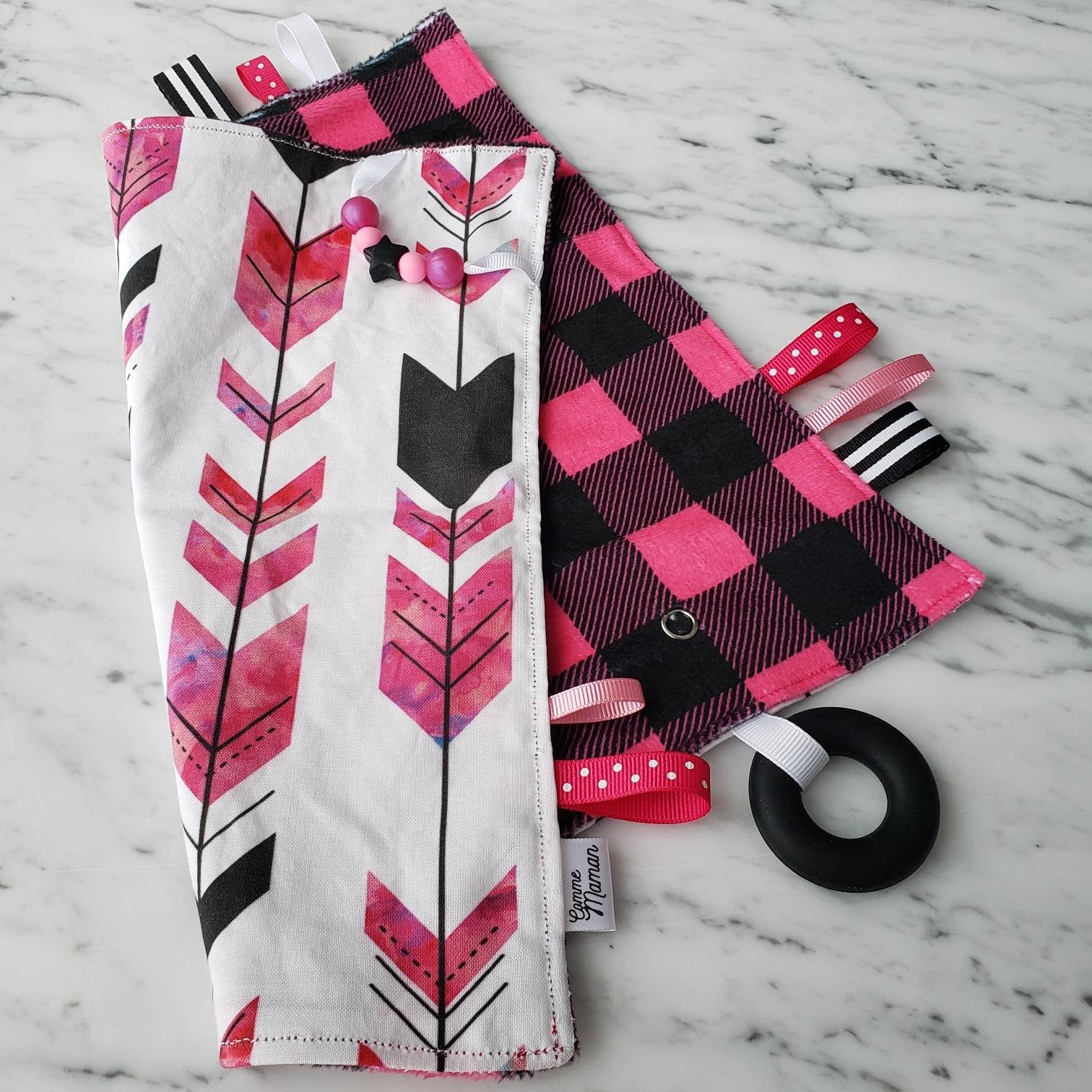 Doudou étiquettes CARREAUTÉ ROSE, bucheron, mini doudou, doudou sensorielle, bille de dentition, accessoire pour bébé, cadeau de shower