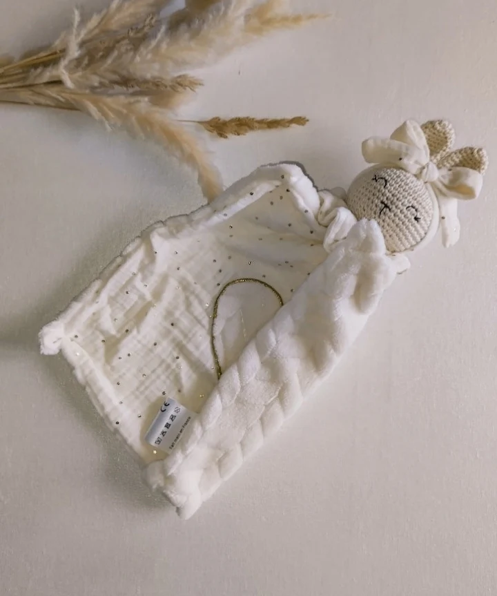 Doudou lapinette fait main au crochet et couture. Le doudou est un compagnon indispensable pour bébé. Il l’accompagne et le rassure dans ces premières années. Le tissu du doudou est un carré de 25/25cm une face en gaze de coton écru point doré et une en tissu doux écru chevron. Le cœur central est réalisé […]