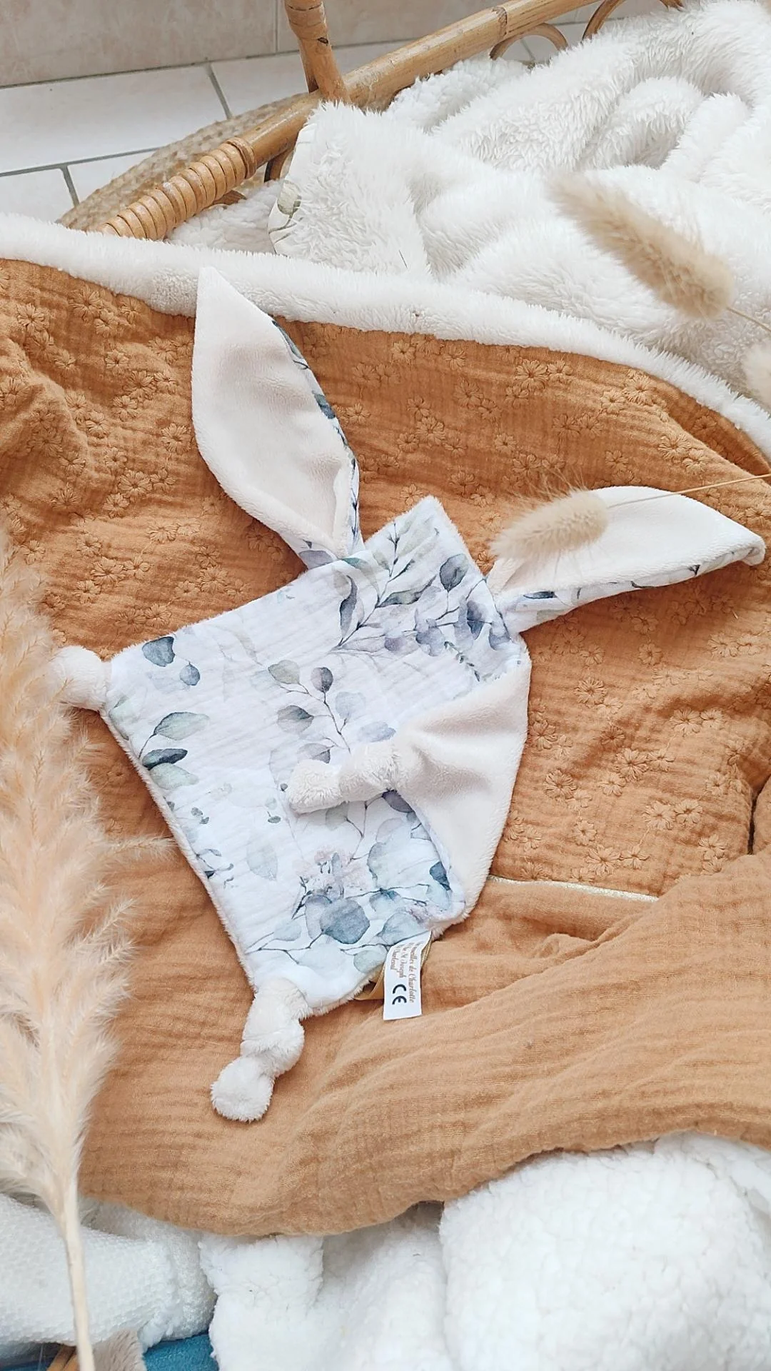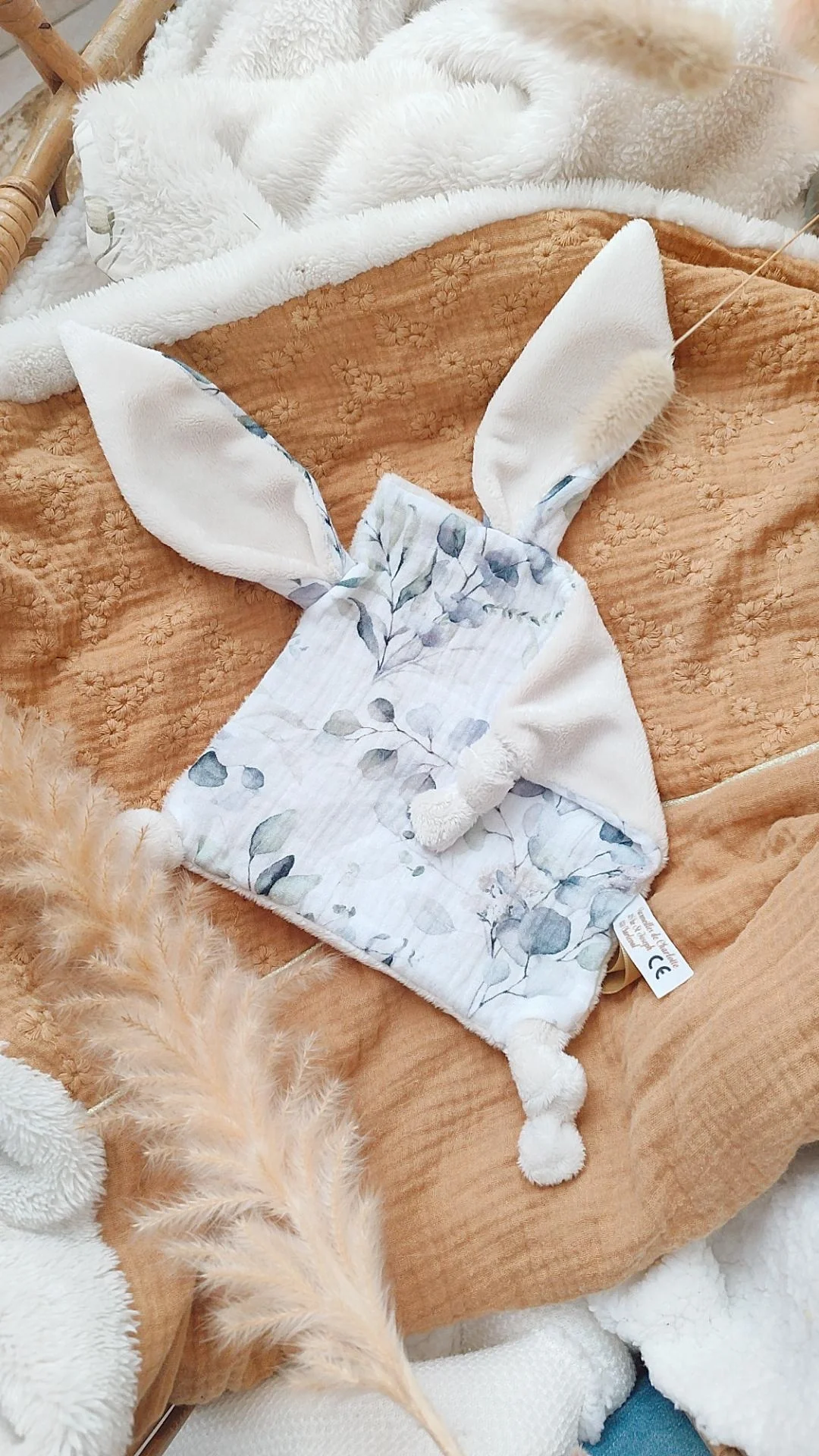 Ses grandes oreilles bi-matières (gaze de coton + minky premium) et son corps 20×20 cm tout doux stimulent les sens de bébé et l’apaisent au quotidien.
