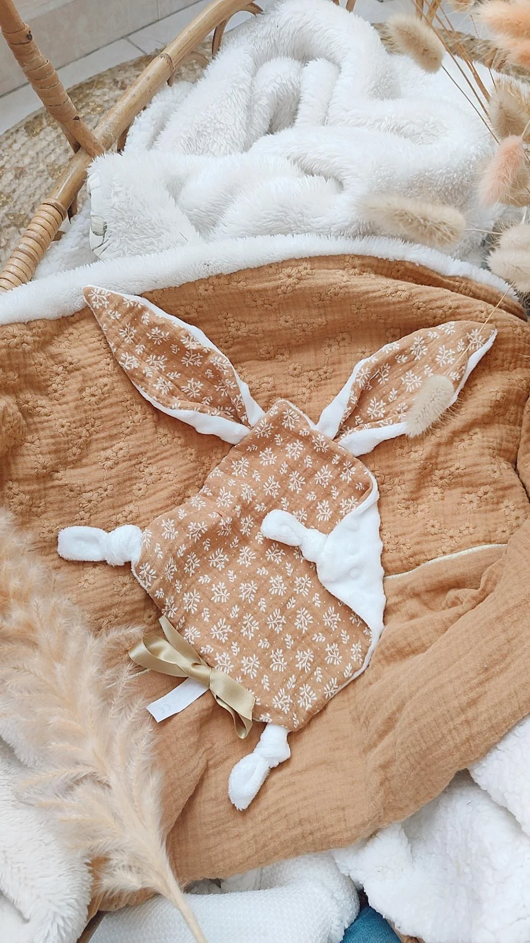 Ses grandes oreilles bi-matières (gaze de coton + minky premium) et son corps 20×20 cm tout doux stimulent les sens de bébé et l’apaisent au quotidien.