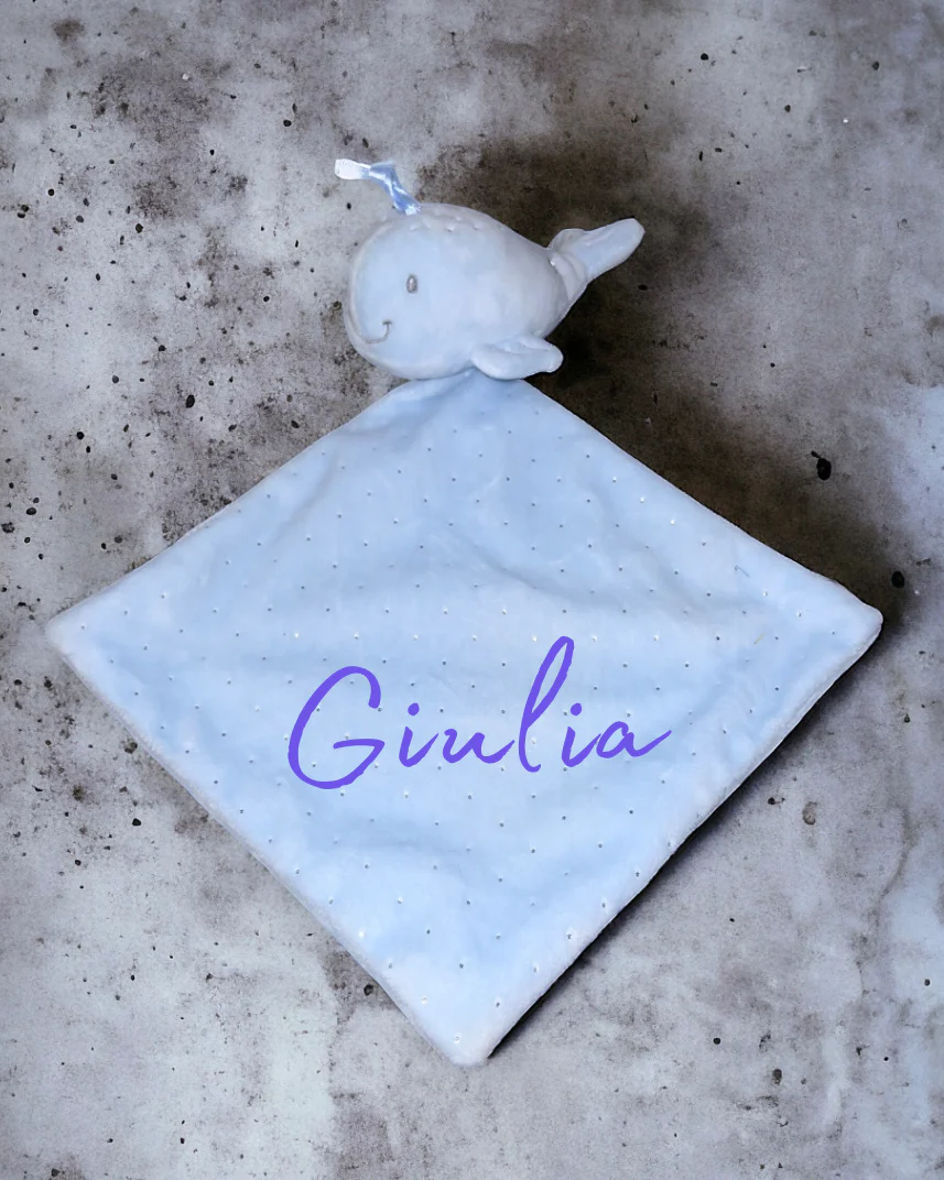 Doudou personnalisé avec le prénom de votre choix Veuillez m’indiquer lors de la commande le prénom ainsi que la couleur du texte souhaité. Information : Le doudou passe en machine à laver mais je déconseille le sèche linge.