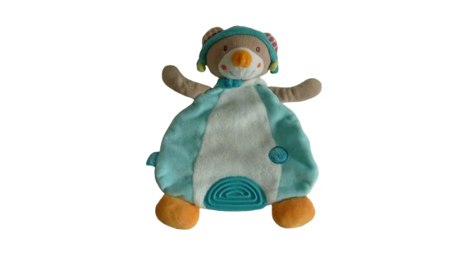 Ce doudou ours plat de la marque Babysun est un compagnon parfait pour votre enfant. Avec ses 27 cm, il est parfaitement adapté aux petites mains et idéal pour les câlins. L’anneau de dentition intégré est très pratique pour soulager les gencives de bébé, tandis que l’écusson « Bon voyage » apporte une touche d’originalité et de douceur à ce doudou. Son design en turquoise, blanc et orange apporte une note joyeuse et apaisante. L’état de ce doudou est comme neuf garantissant une qualité parfaite pour son utilisation.