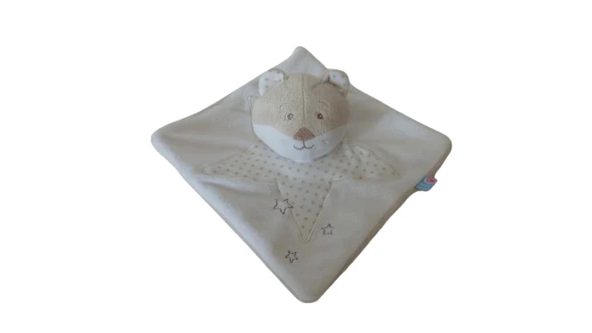 Ce doudou ours plat de la marque Sucre d’Orge est idéal pour apporter douceur et réconfort dès la naissance. Avec ses dimensions d’environ 19×19 cm, il se manipule facilement par les petites mains. Dans des tons doux de blanc et beige, il est décoré d’un motif étoiles plein de tendresse. Sa texture moelleuse et sa légèreté en font un allié parfait pour les câlins quotidiens.