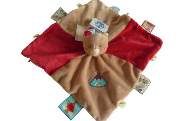 Avec sa texture moelleuse et ses couleurs chaleureuses, ce doudou plat en forme d’ours de la marque Noukie’s deviendra vite le fidèle allié des tout-petits. Facile à manipuler grâce à son format d’environ 27×27 cm, il se glisse partout : au creux du lit, dans la poussette ou le sac à langer. Son duo de tons marron et rouge en fait un compagnon à la fois rassurant et joyeux.