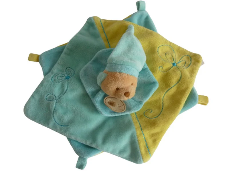 Doudou ours plat bleu turquoise jaune – Baby’Nat