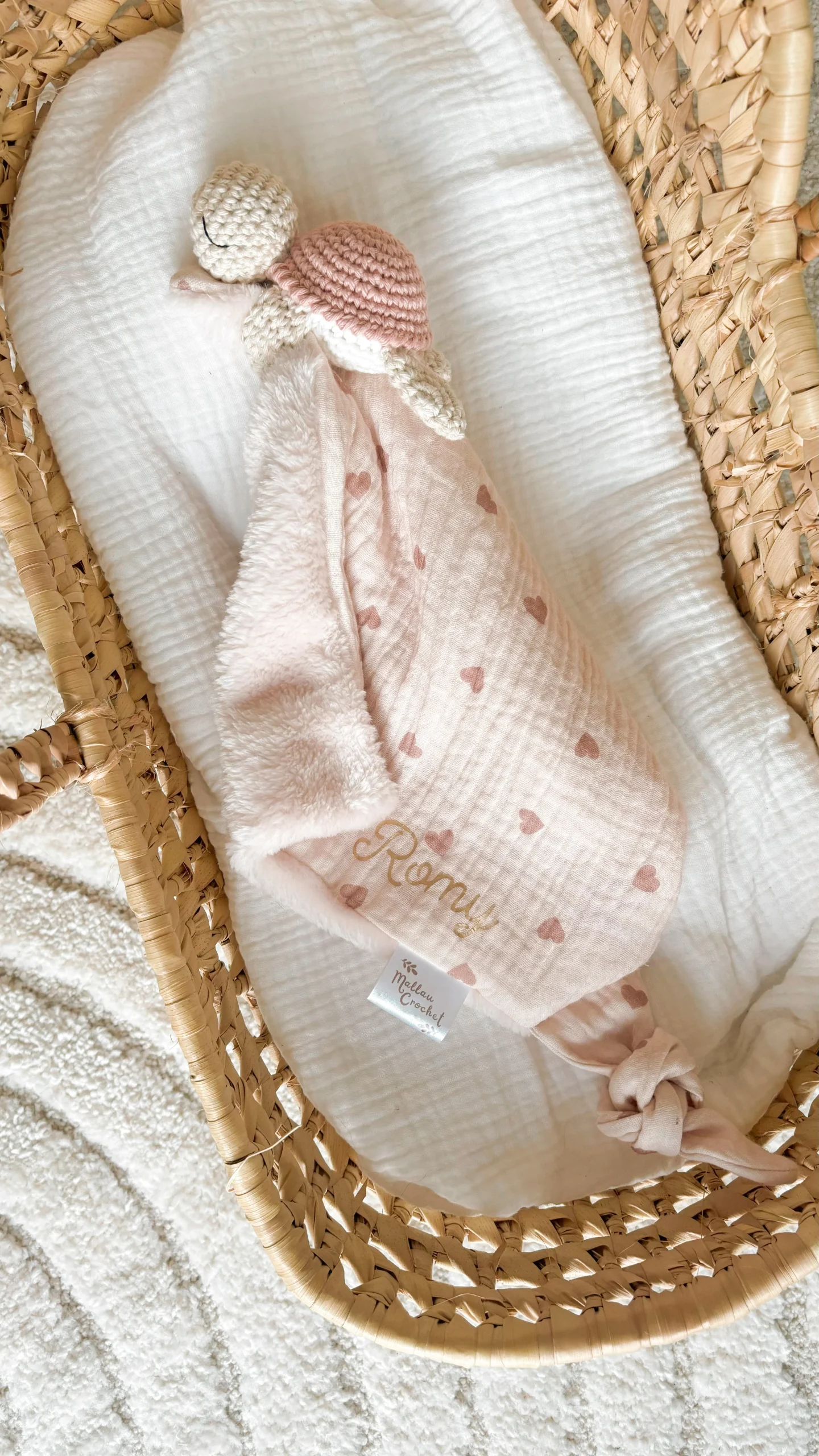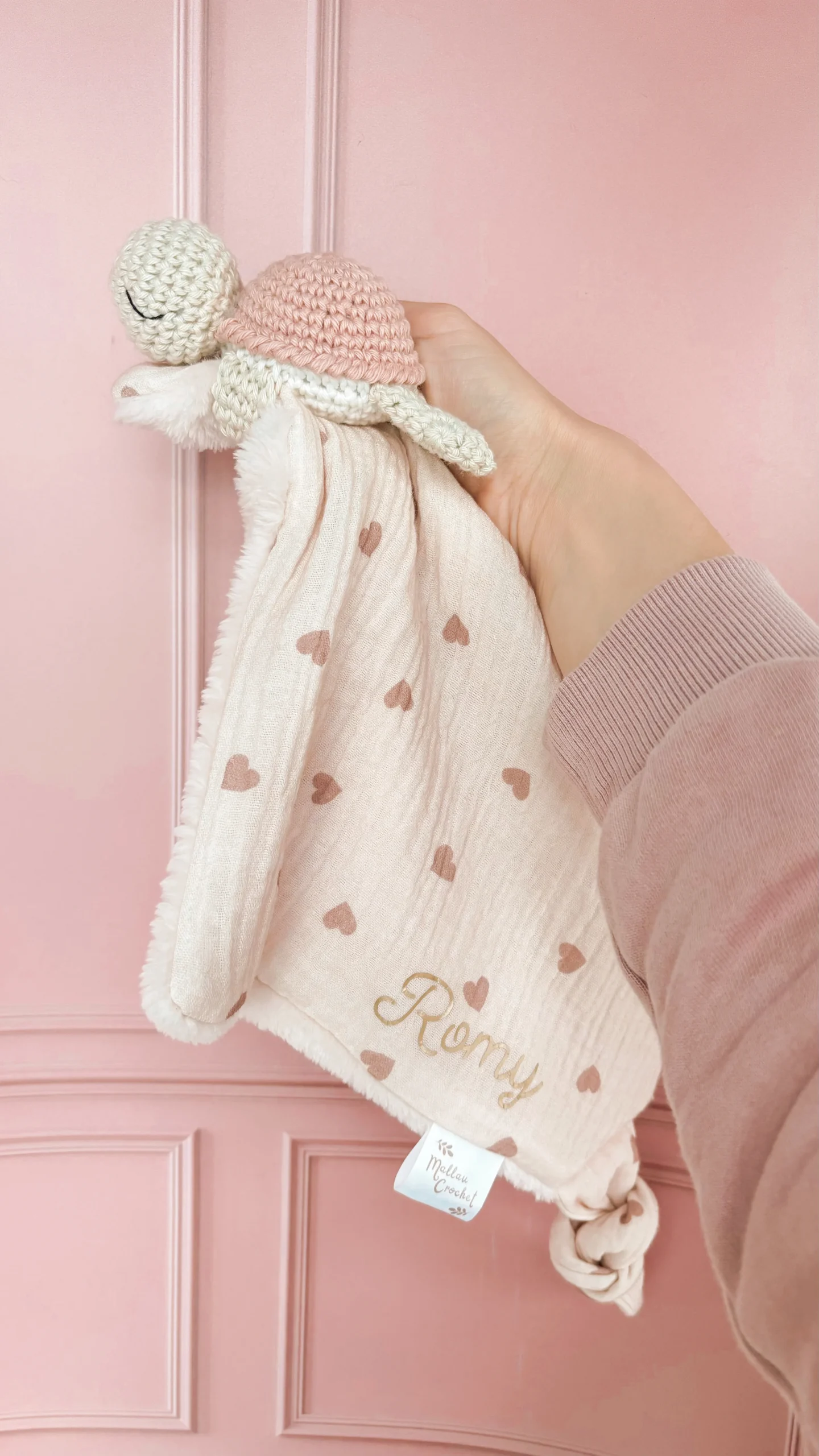 Doudou lange tortue personnalisé au crochet Un doudou tout doux pour bébé grâce au double gaze de coton et son envers en fausse fourrure . Les yeux sont brodés sur le visage et sont donc sécurisés pour bébé.La tortue est assemblée et fixée solidement au carré de tissus Nos doudous ont été testés en laboratoire […]