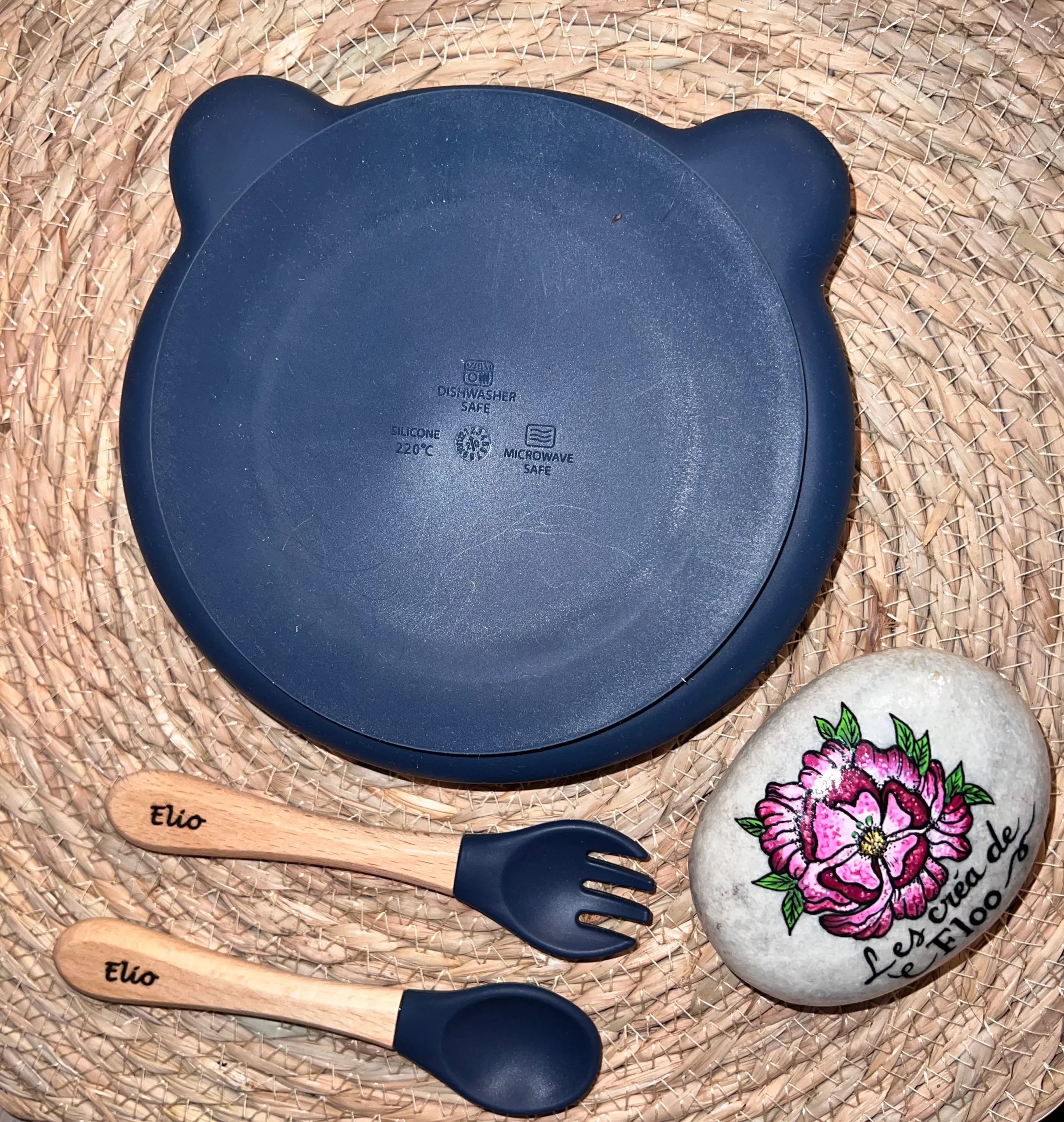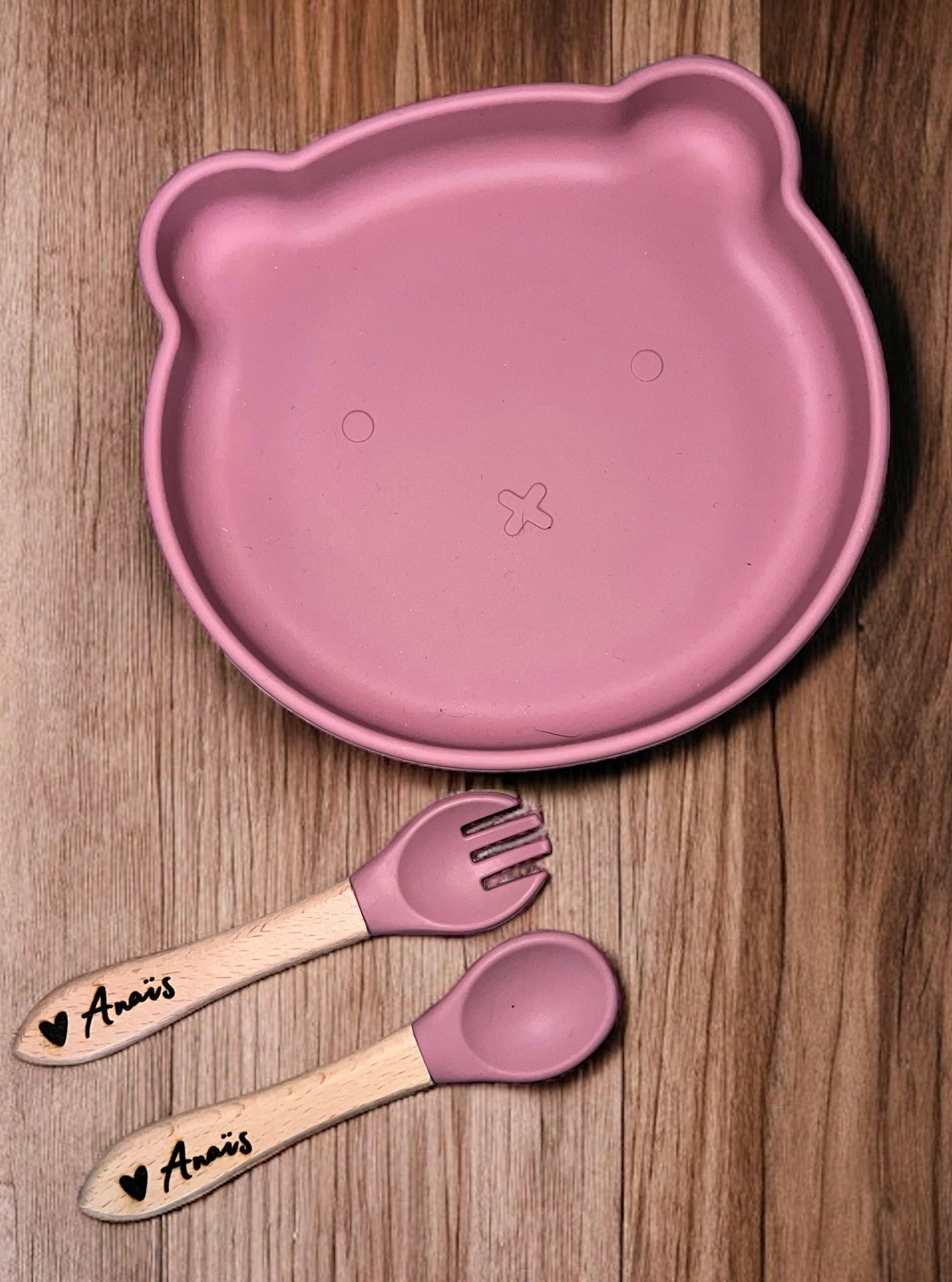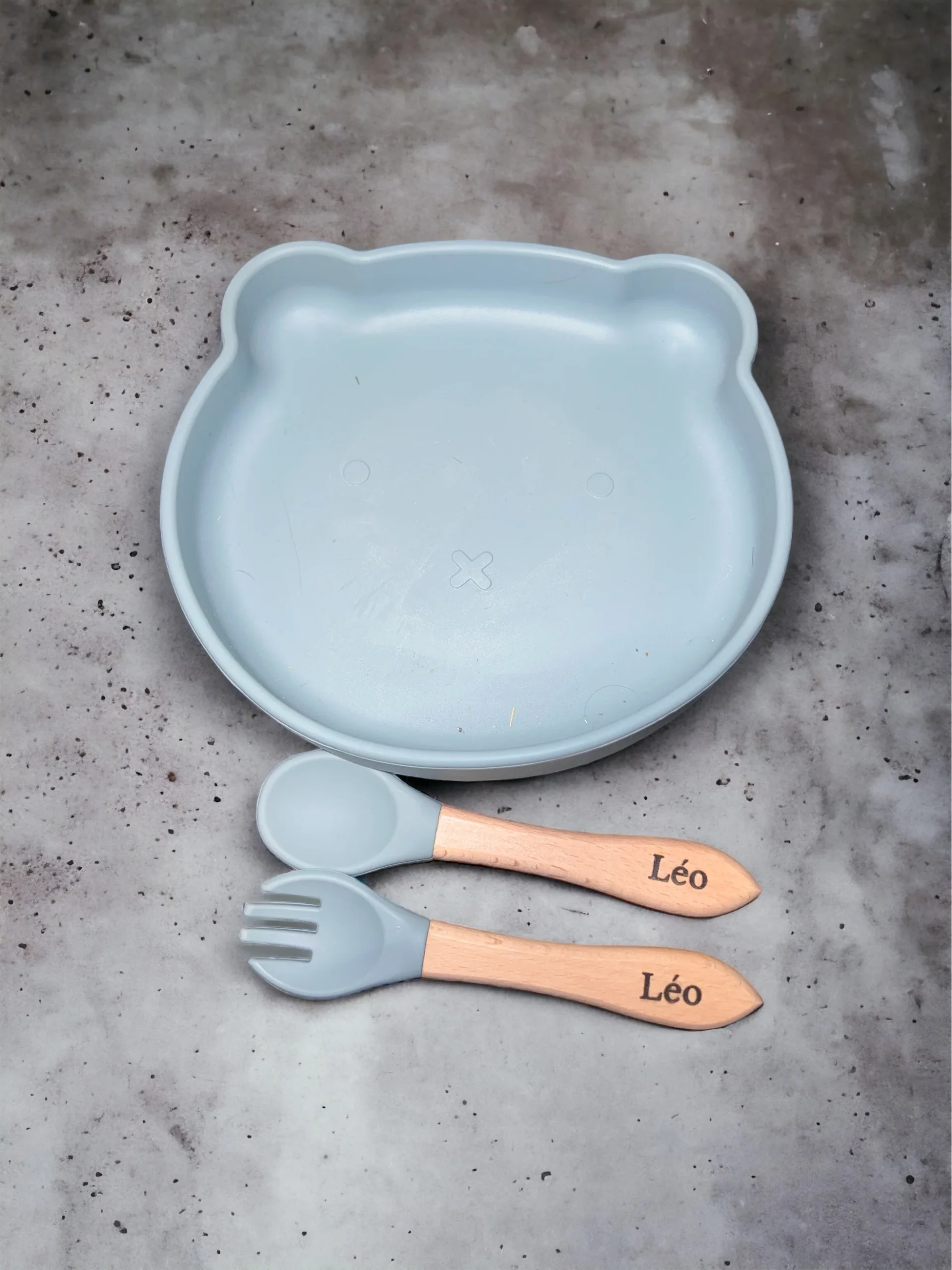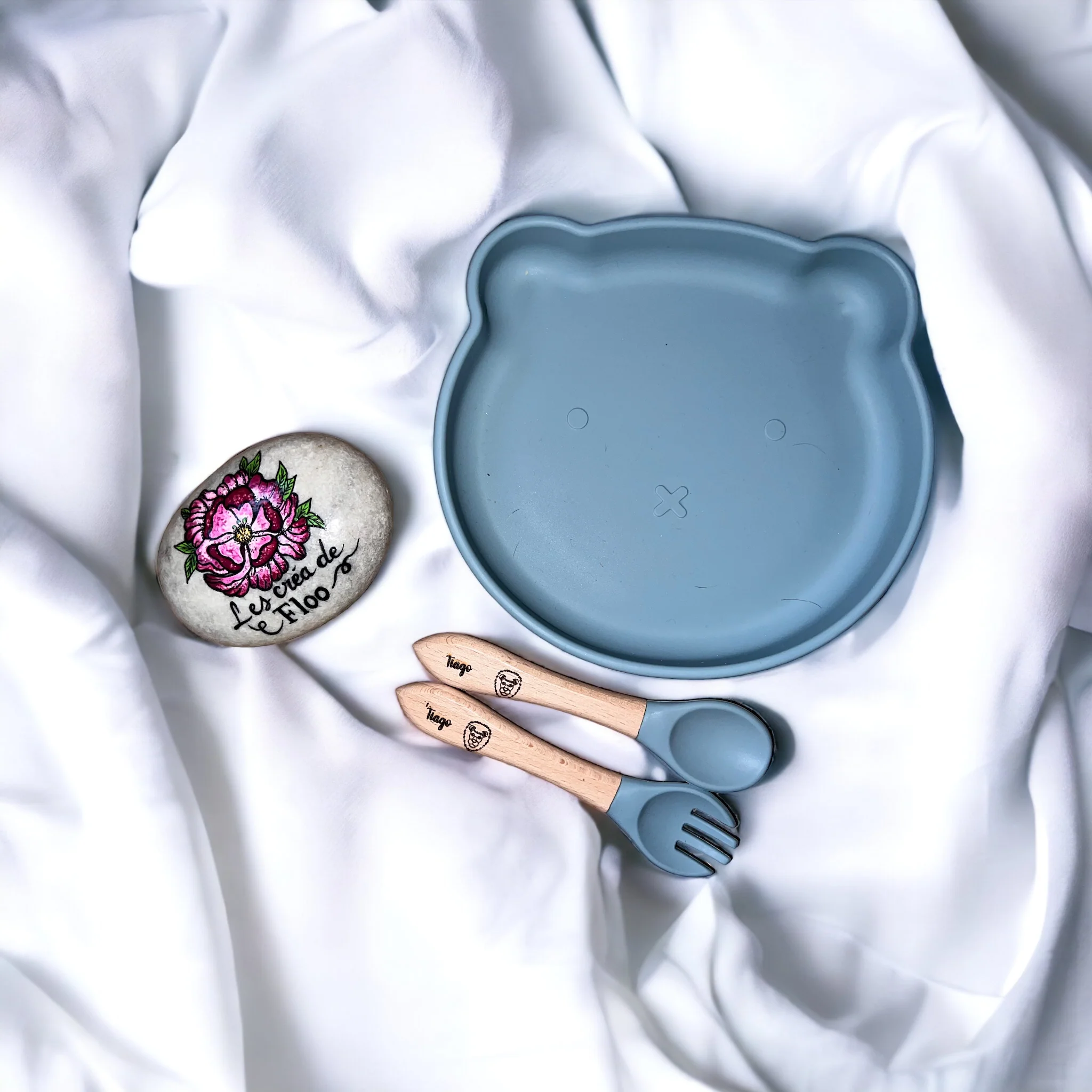 Duo assiette ventouse ourson et couverts personnalisés pour enfants / bébés