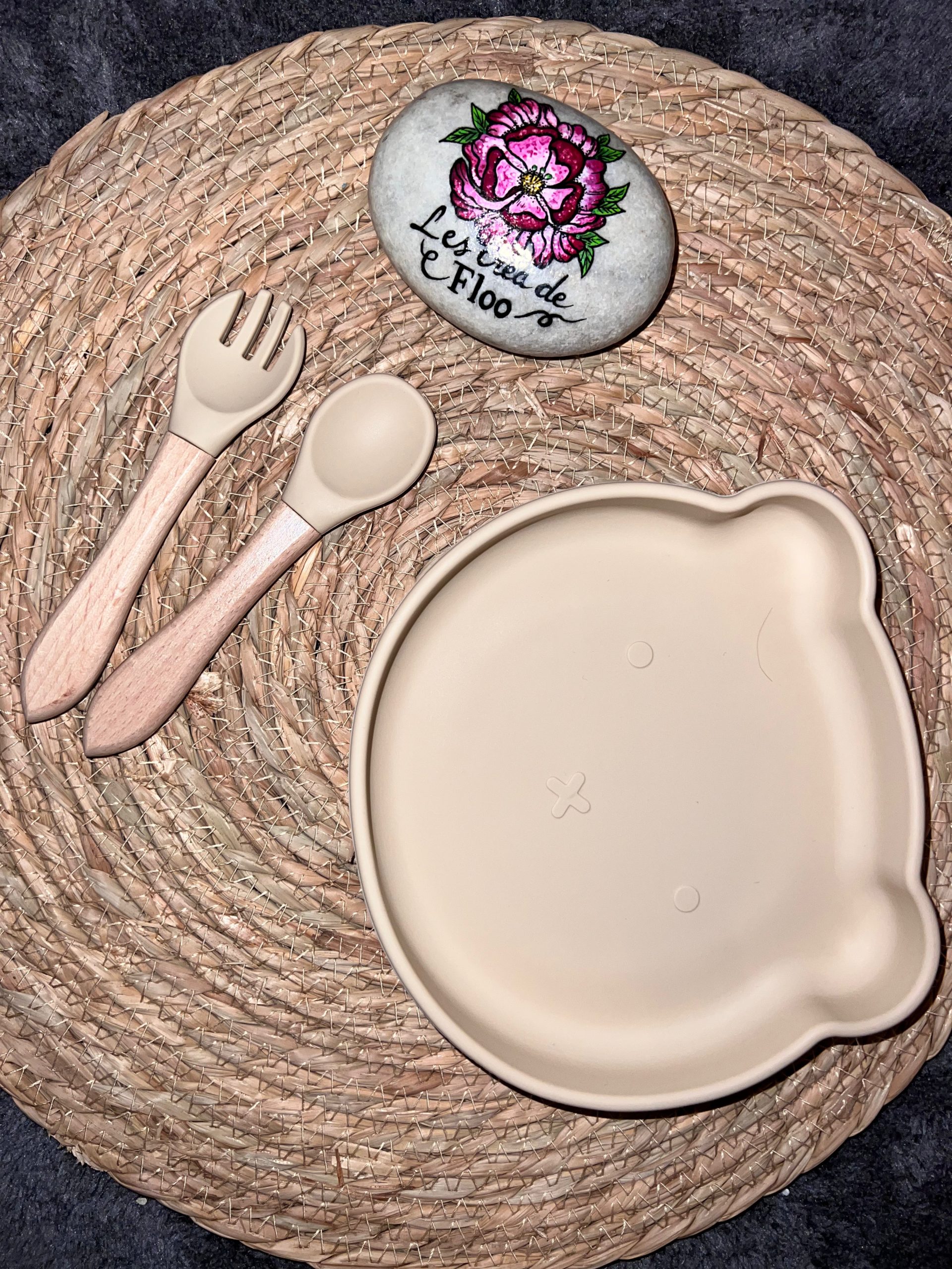 – Une assiette en silicone en forme d’ourson avec une ventouse pour éviter qu’elle ne se renverse