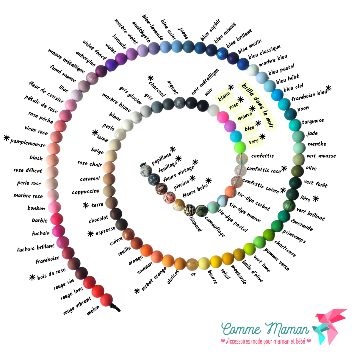 Les tirettes sont faits de billes de silicone de qualité, faites de 100% de silicone alimentaire sans BPA, sans PVC, sans Phtalates, sans plomb, sans mercure et sans cadmium.