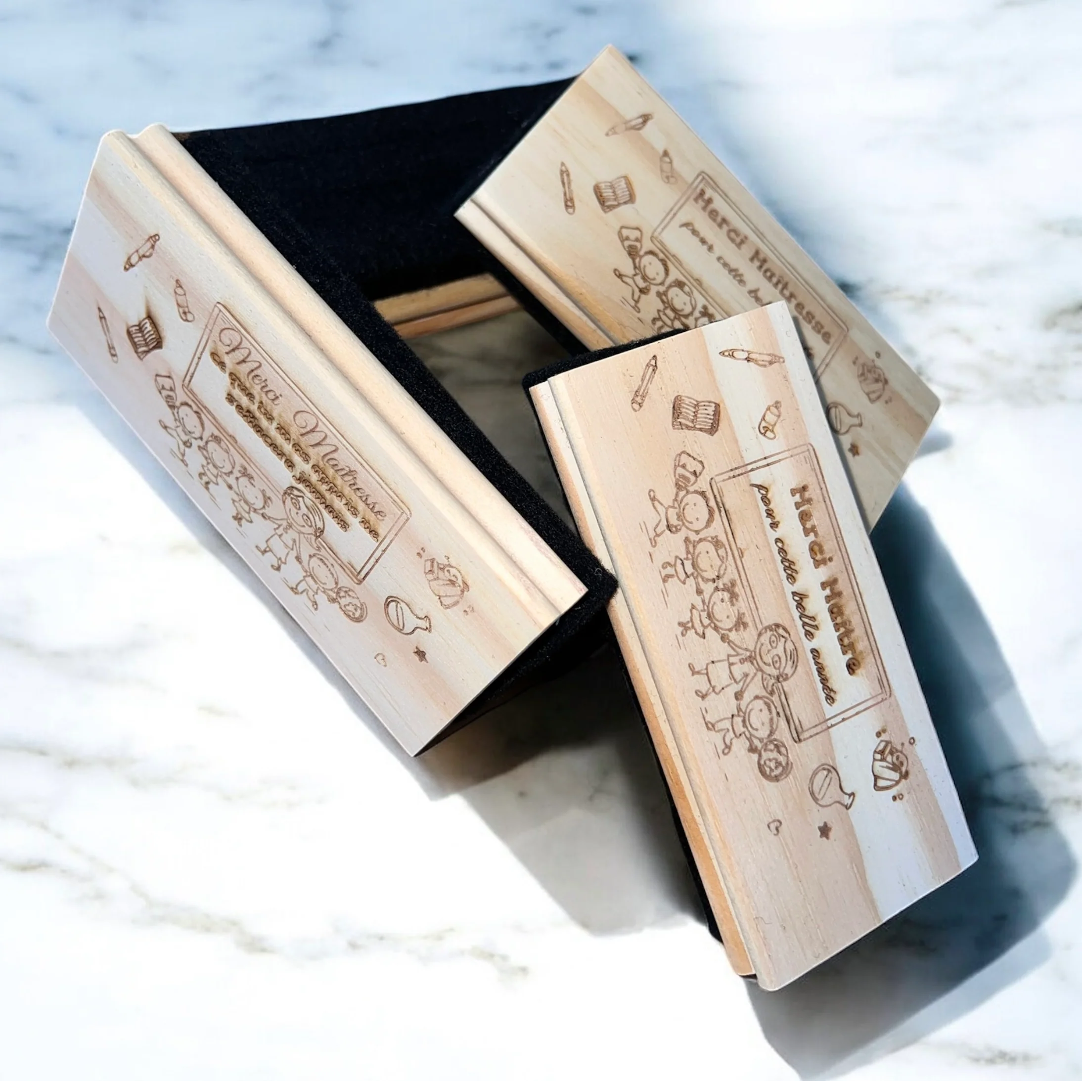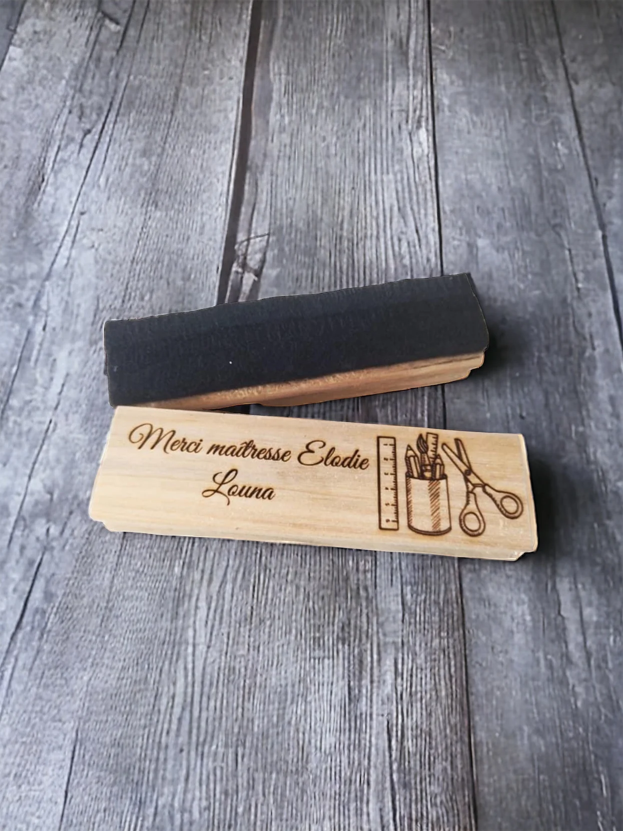Vous recherchez le cadeau parfait pour une ou un enseignant, cette brosse pour tableau sera parfaite personnalisée, elle rendra votre cadeau totalement unique.Elle mesure 12x6x3cm et est faite de bois.