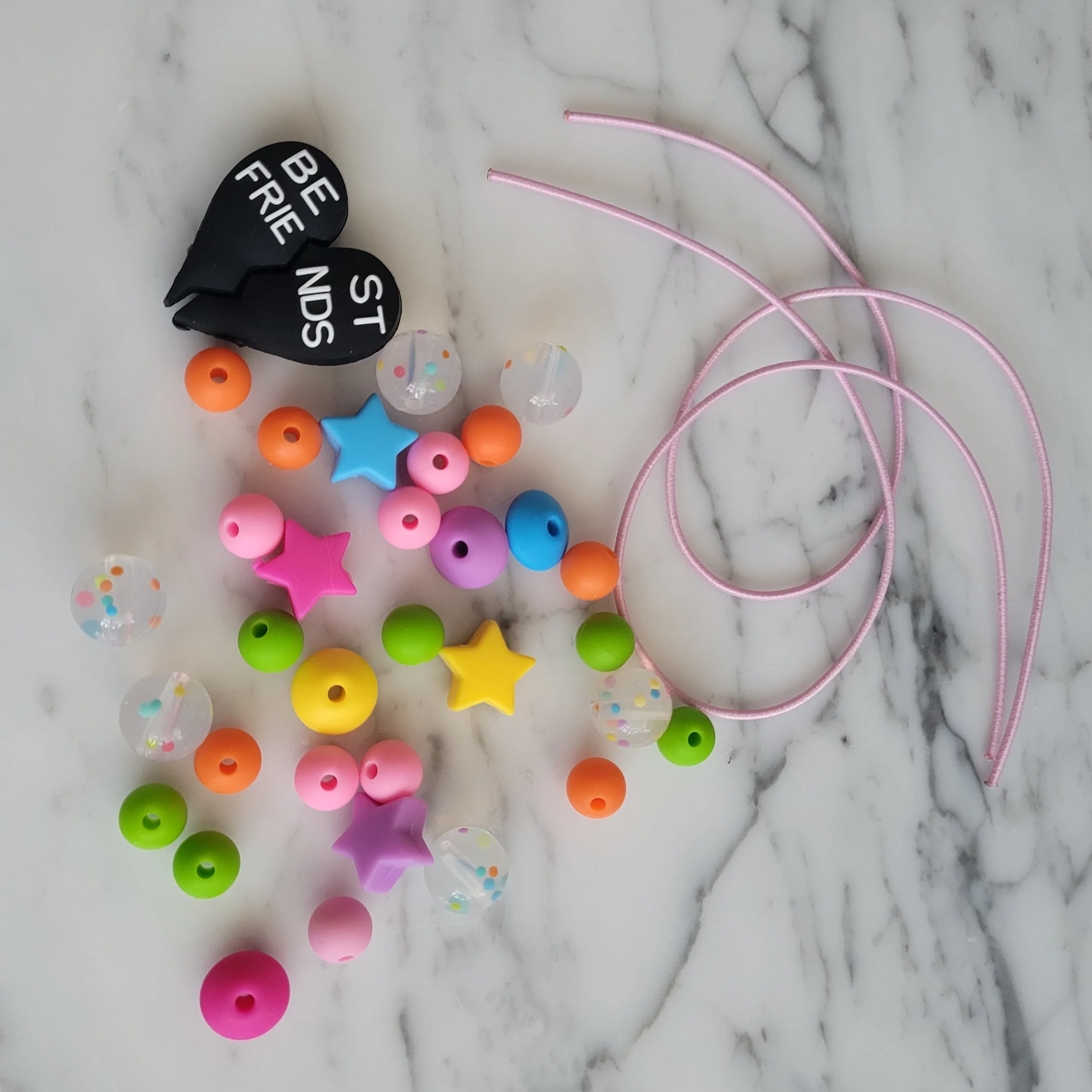 Le kit duo, inclus des billes de silicone alimentaire, un cordon élastique et des instructions d’assemblage.