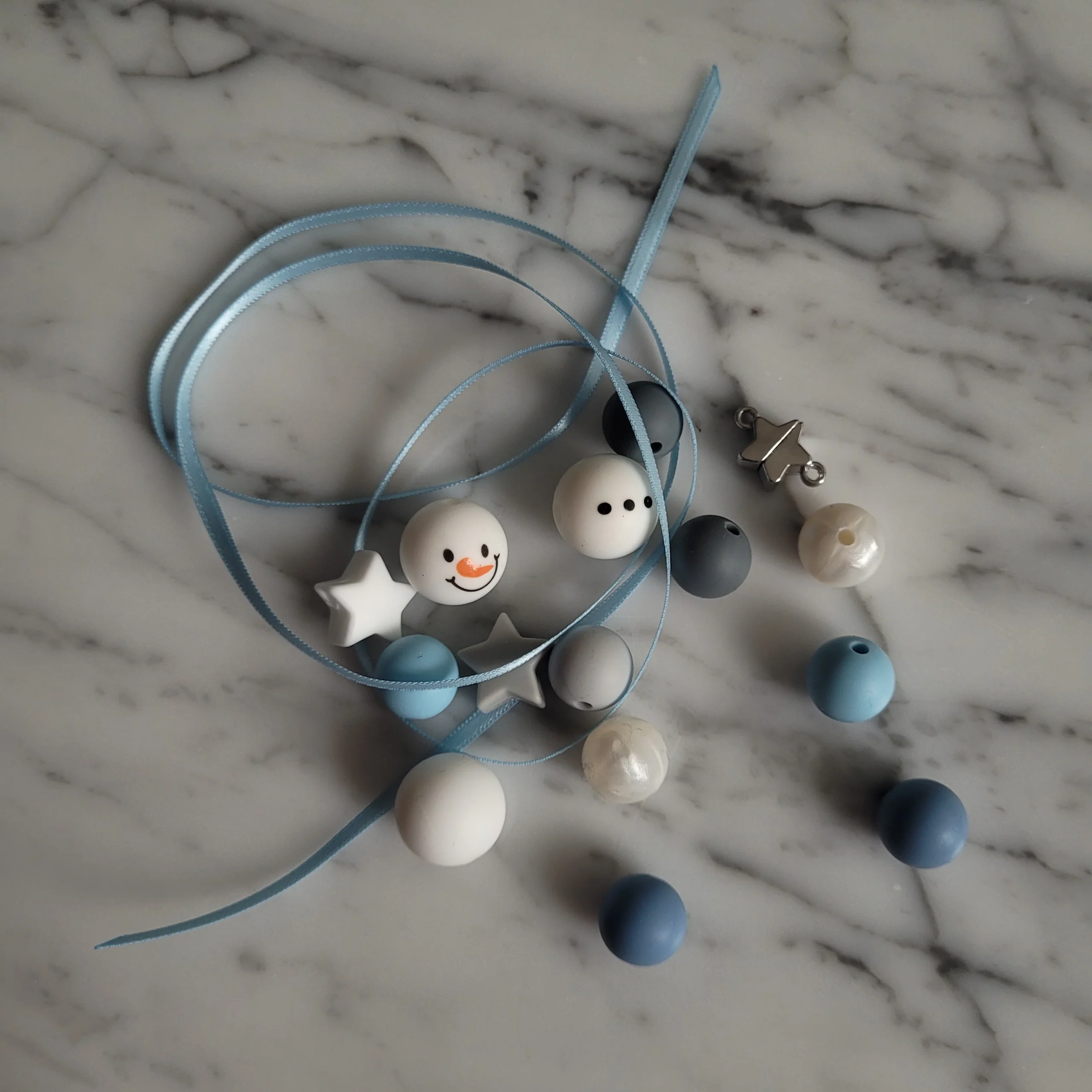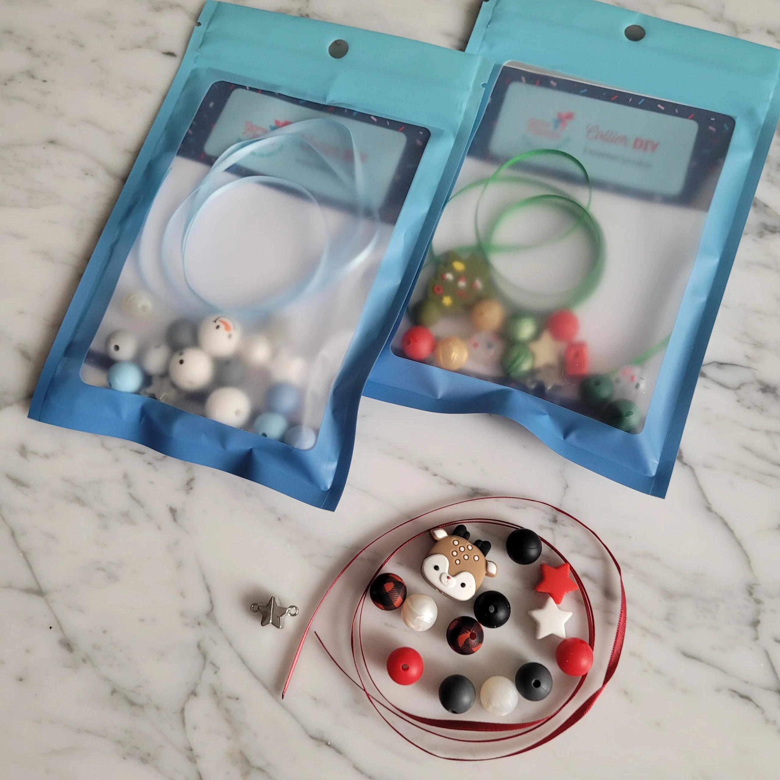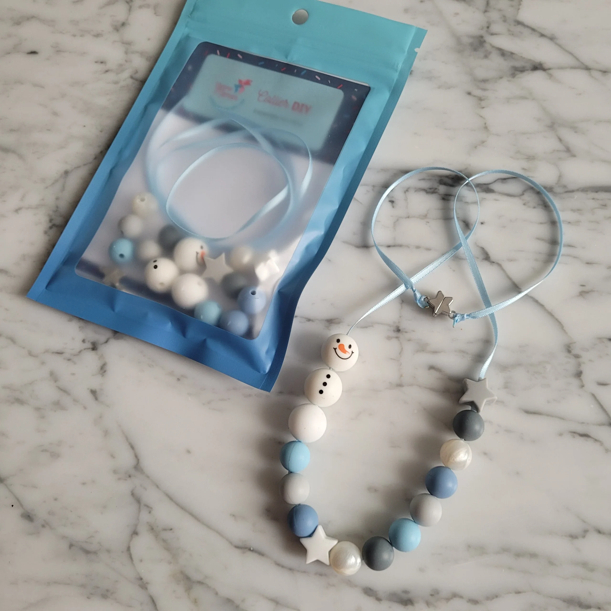 Le kit collier, inclus des billes de silicone alimentaire, un ruban coloré, un fermoir aimanté en forme d’étoile et des instructions d’assemblage.