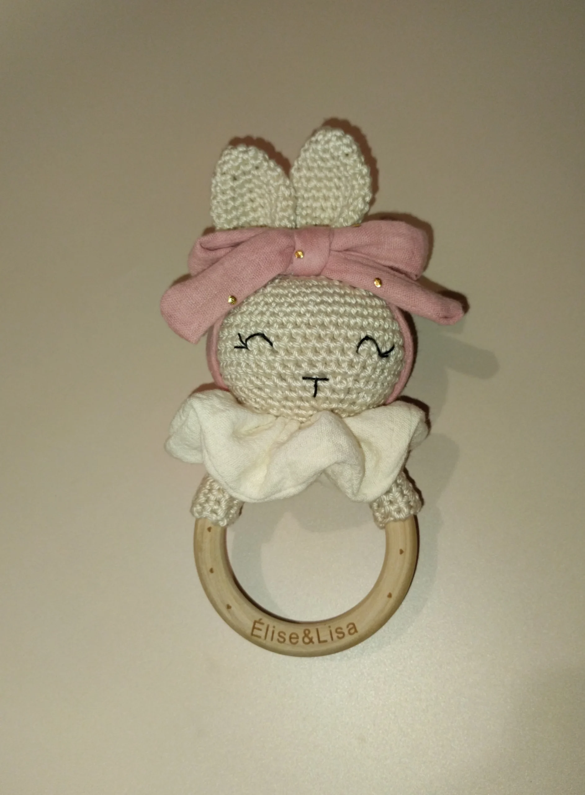 Ensemble doudou et hochet lapinette fait main par mes soins au crochet et couture.