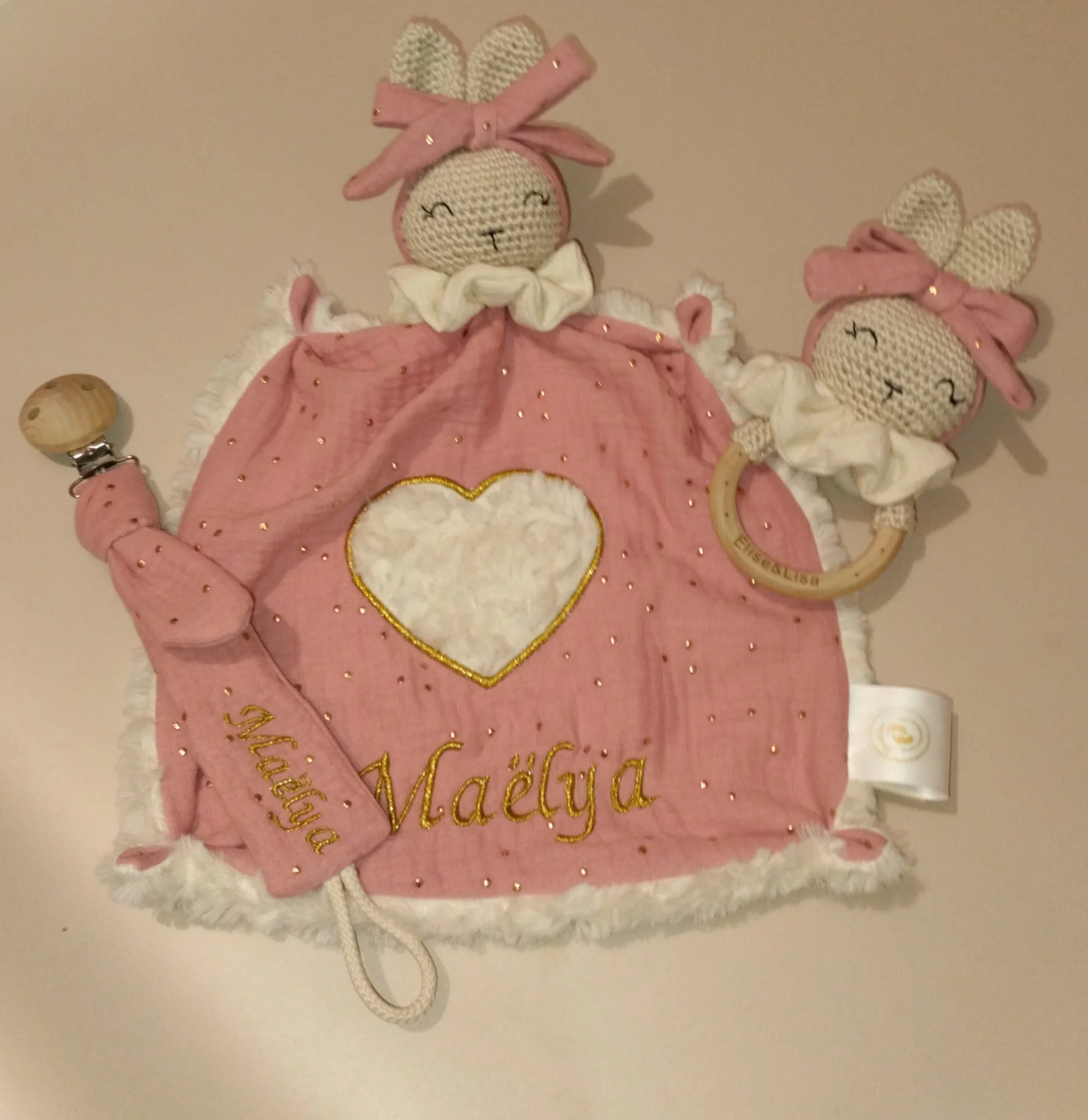 Ensemble doudou, hochet et attache lapinette Love vieux rose en crochet et couture