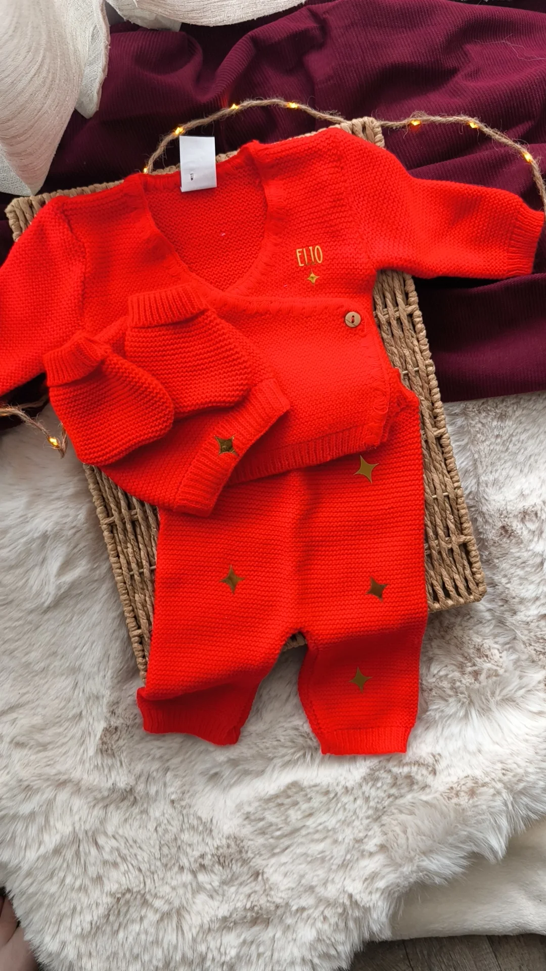 Cet adorable ensemble en maille « Mon premier Noël » garde bébé bien au chaud pour partager ses premiers câlins au pied du sapin.