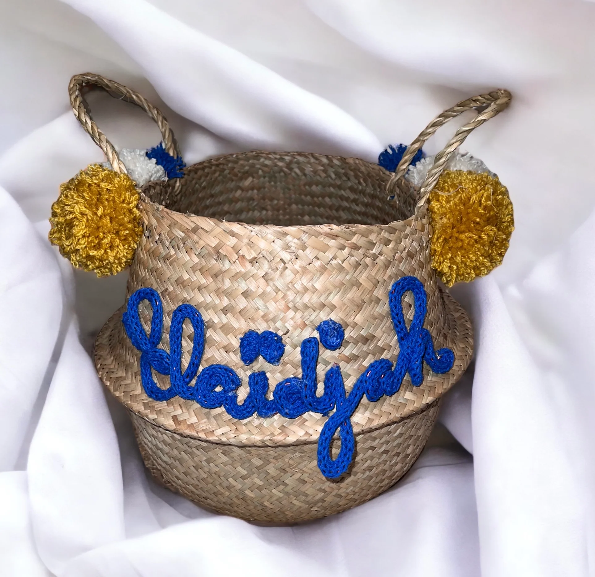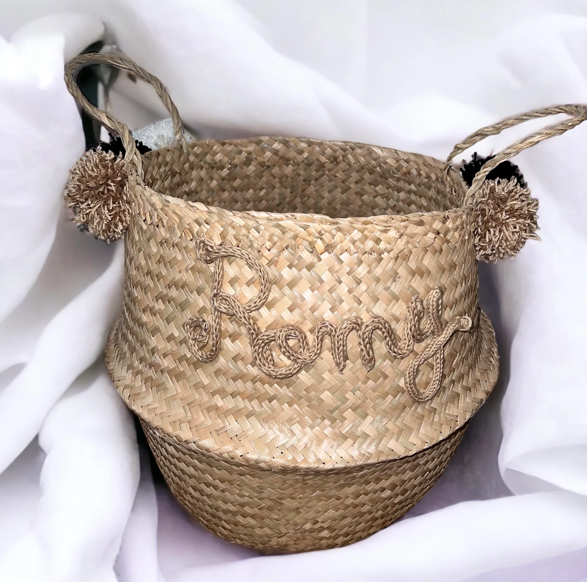 Grand panier personnalisé jonc de mer, panier de rangement personnalisé avec tricotin prénom