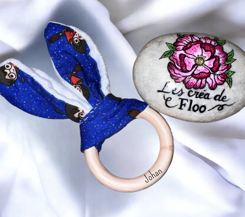 Hochet personnalisé avec le prénom de votre choix. Différents modèles sont disponibles. Le prénom est gravé dans le bois. Idée originale pour cadeau naissance Cet article étant personnalisé aucun retour n’est possible.