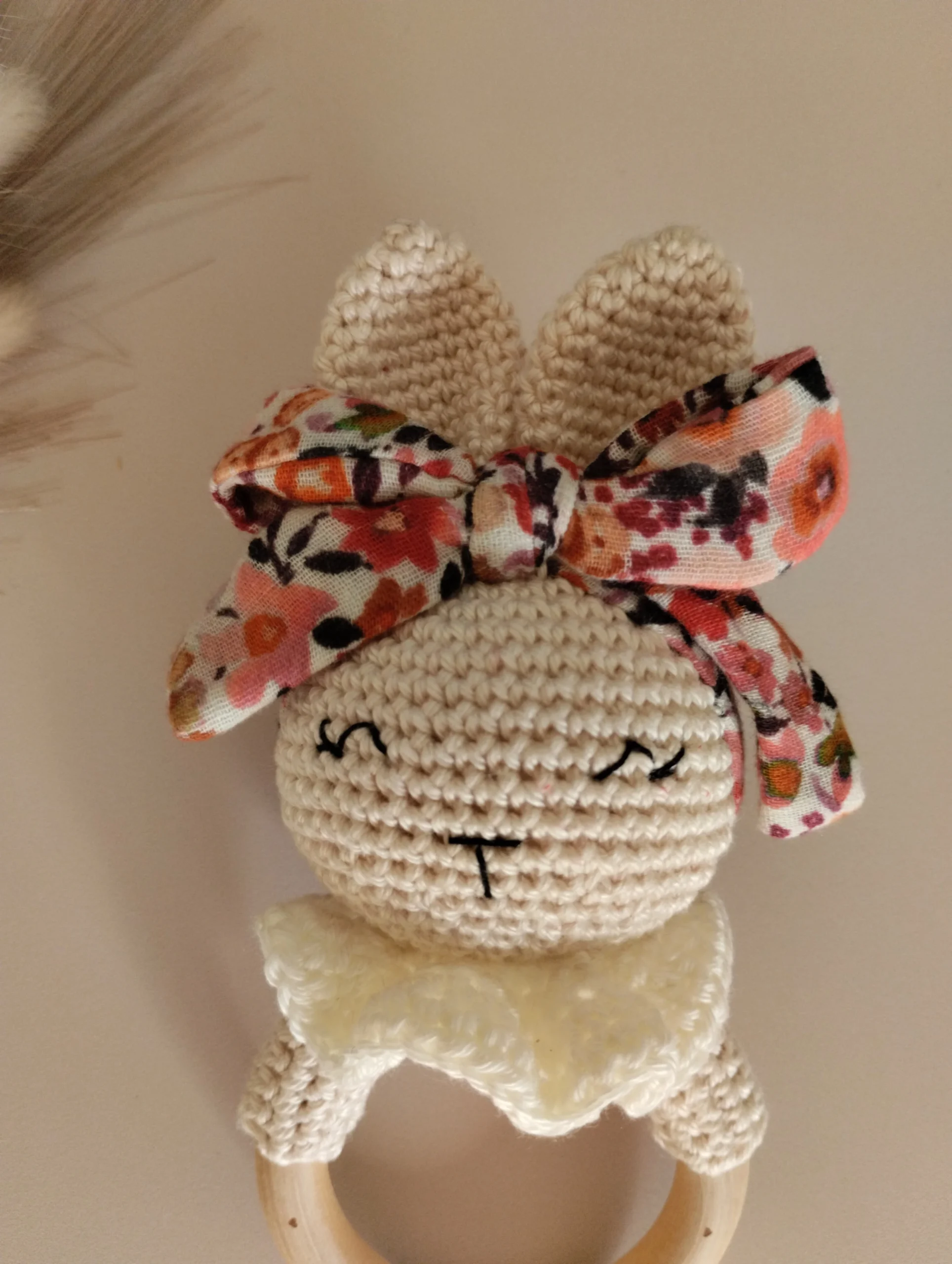 Hochet lapinette réaliser au crochet et sa collerette en crochet sur un anneau en bois naturel ( non traité)
