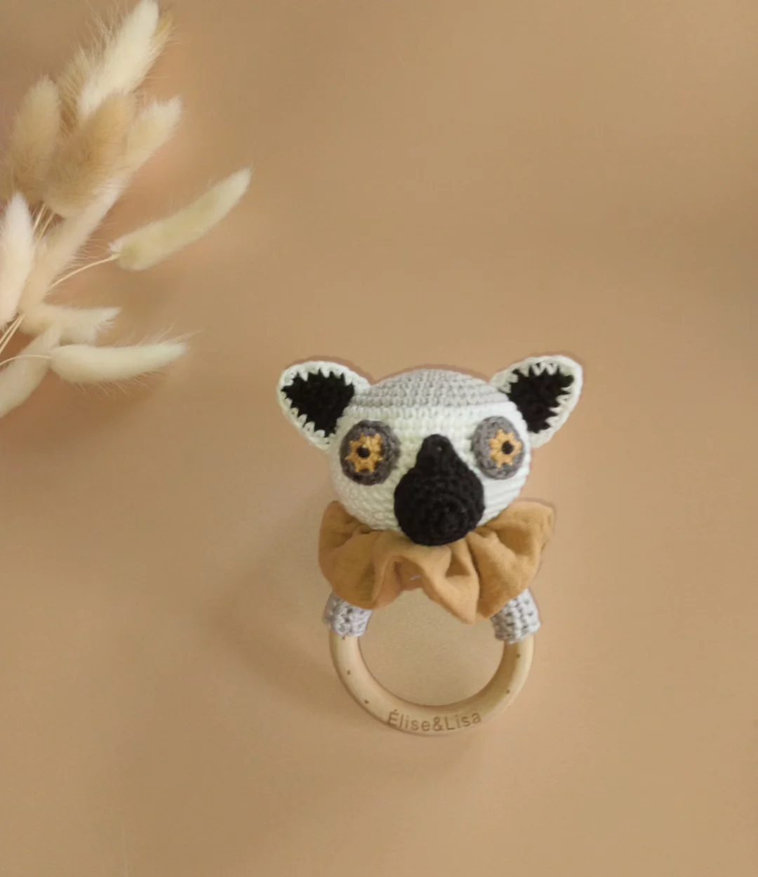 Hochet lémurien réalisé par mes soins au crochet avec une jolie collerette en couture.