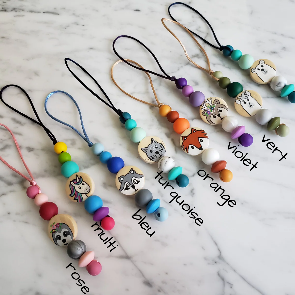 Les identificateurs sont peint à la mais sur une pastille de bois et de billes de silicone de qualité, faites de 100% de silicone alimentaire sans BPA, sans PVC, sans Phtalates, sans plomb, sans mercure et sans cadmium