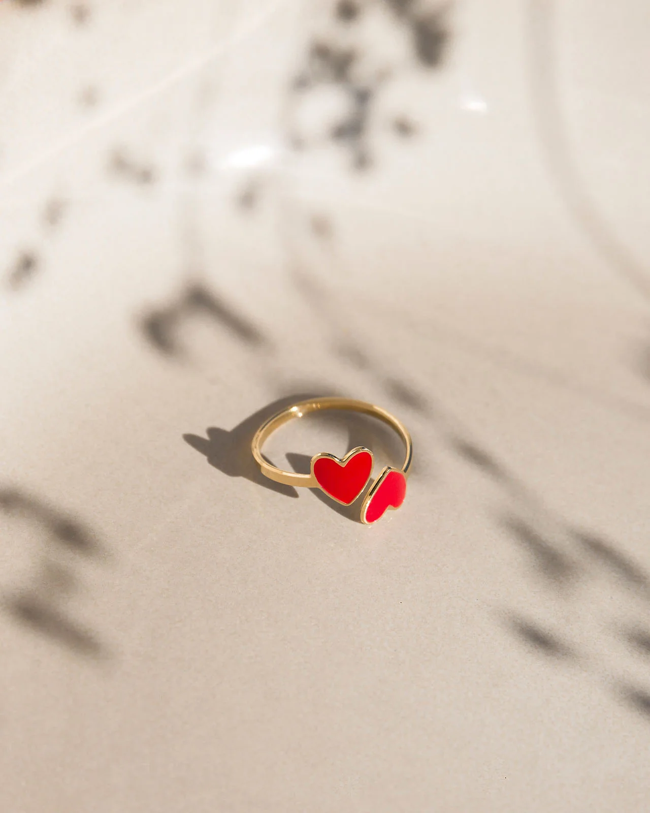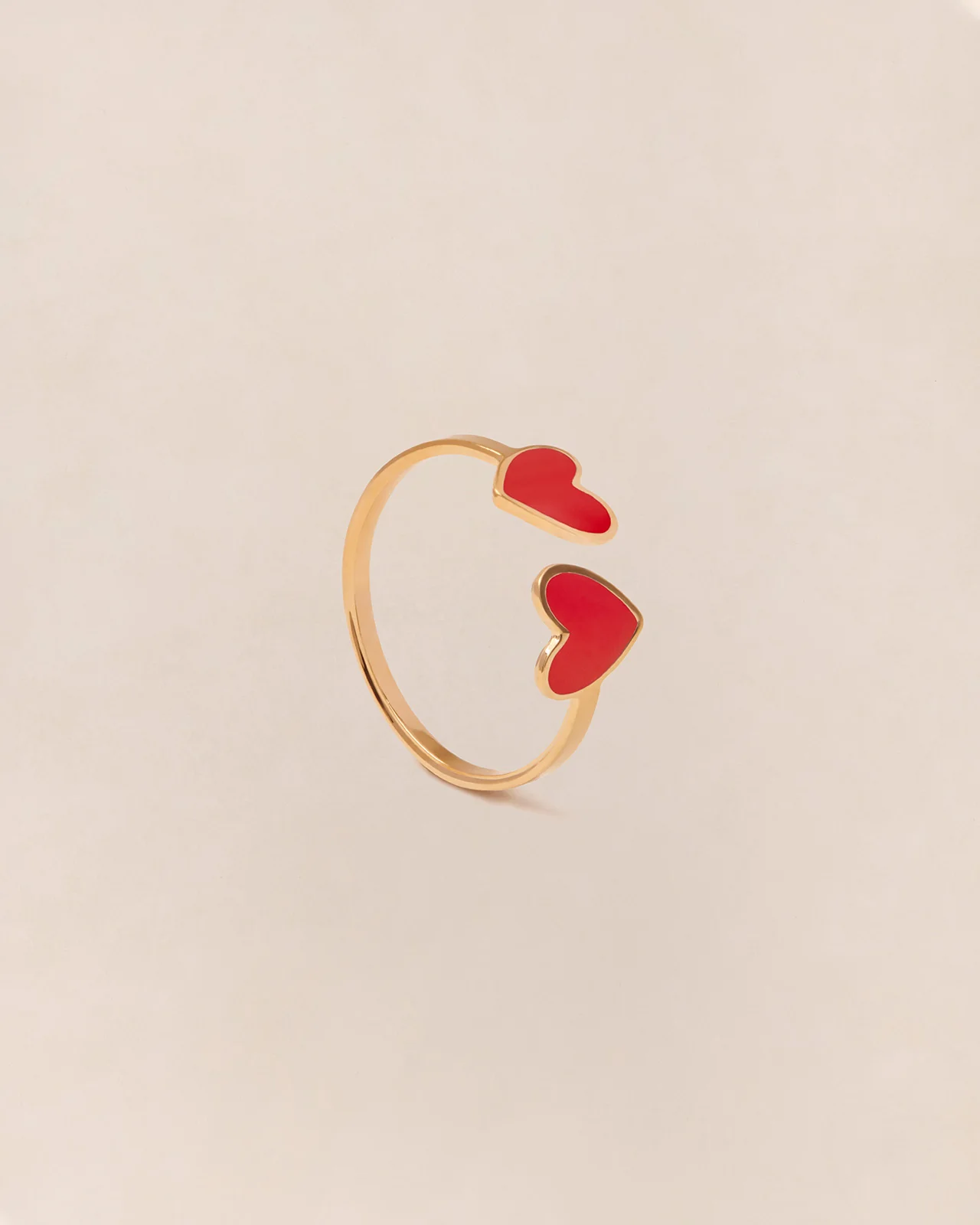 La bague Billie 2 cœurs rouges – dorée à l’or fin 24 carats