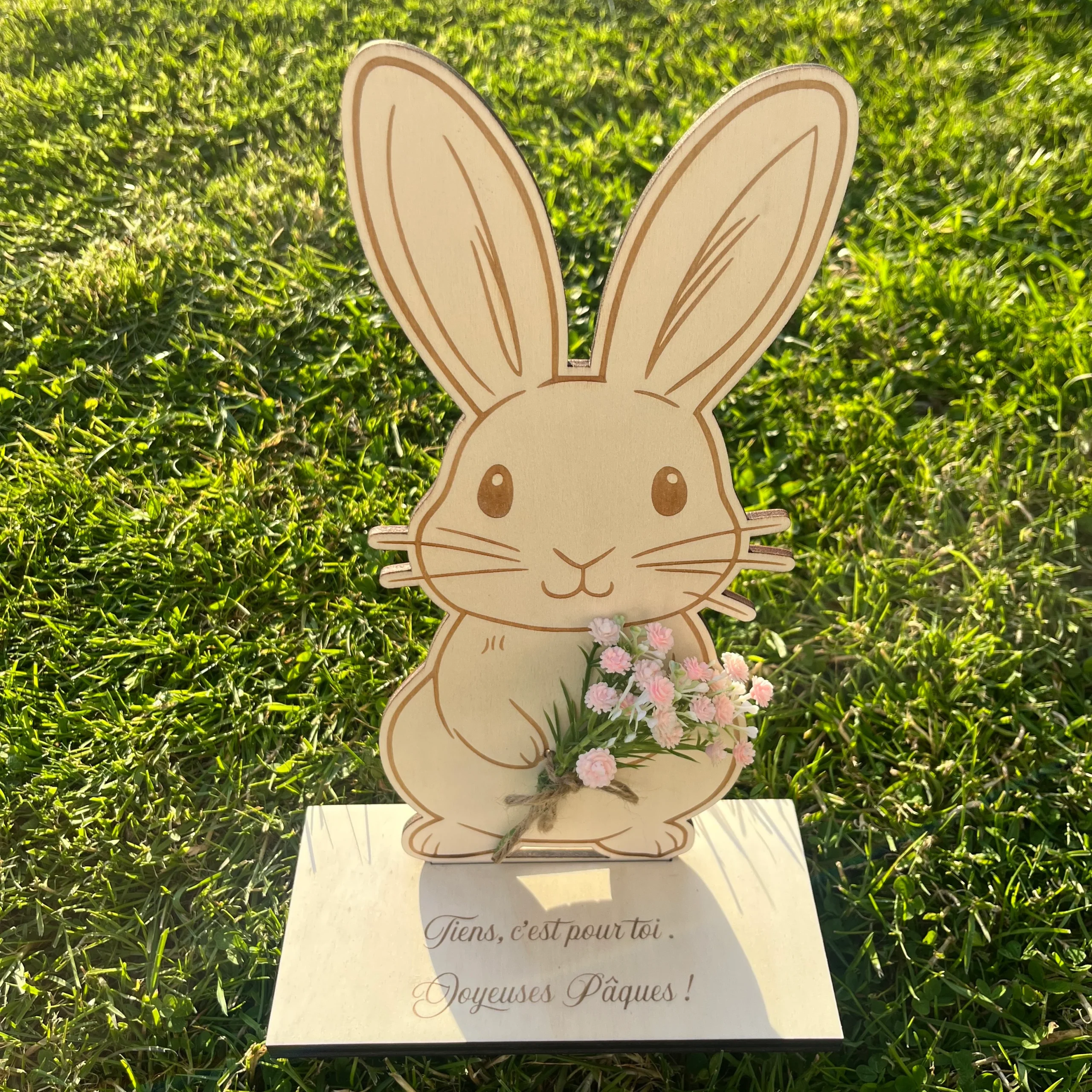 Lapin de Pâques avec petit bouquet de fleurs artificielles roses Socle en bois personnalisable avec le texte de votre souhait à préciser dans l’encart dédié. Dimensions : 30x14cm Le bois étant une matière naturelle et vivante, des nuances peuvent apparaitre sur les créations. Photo non contractuelle.