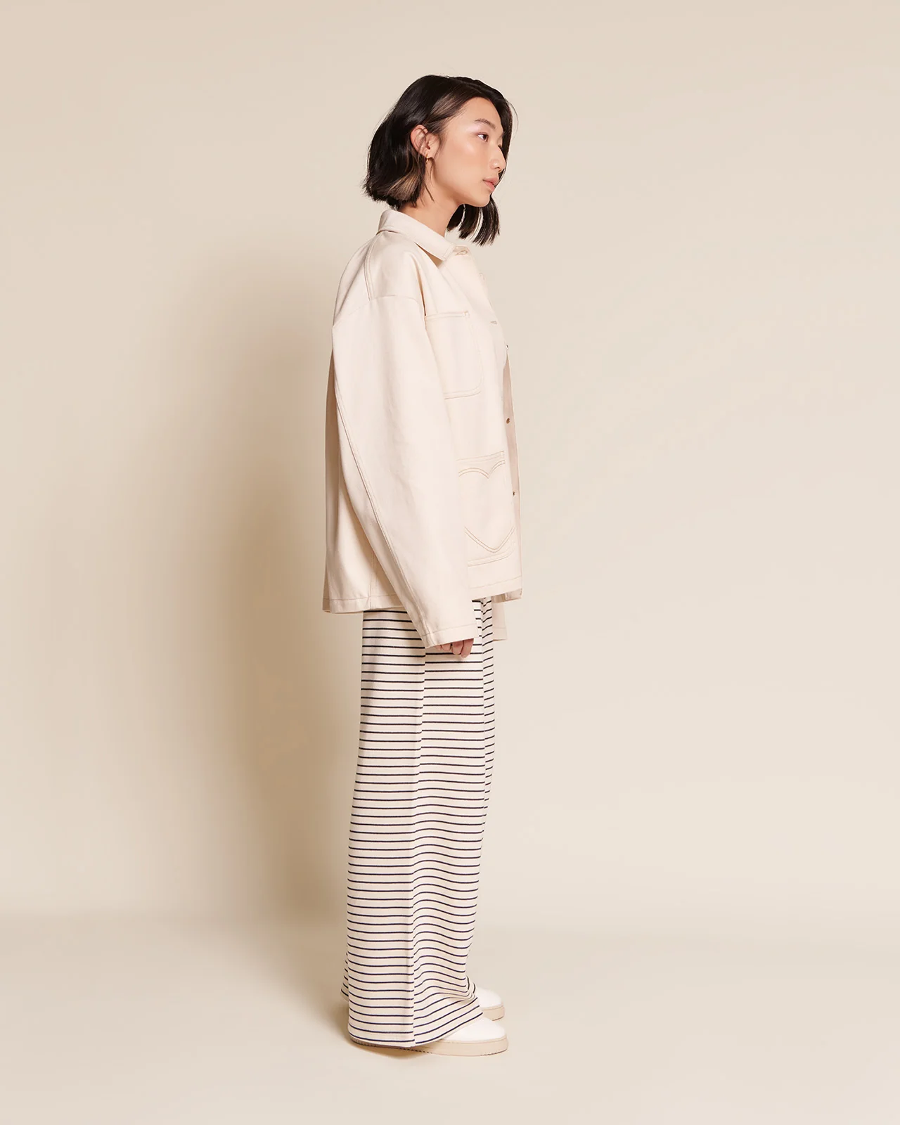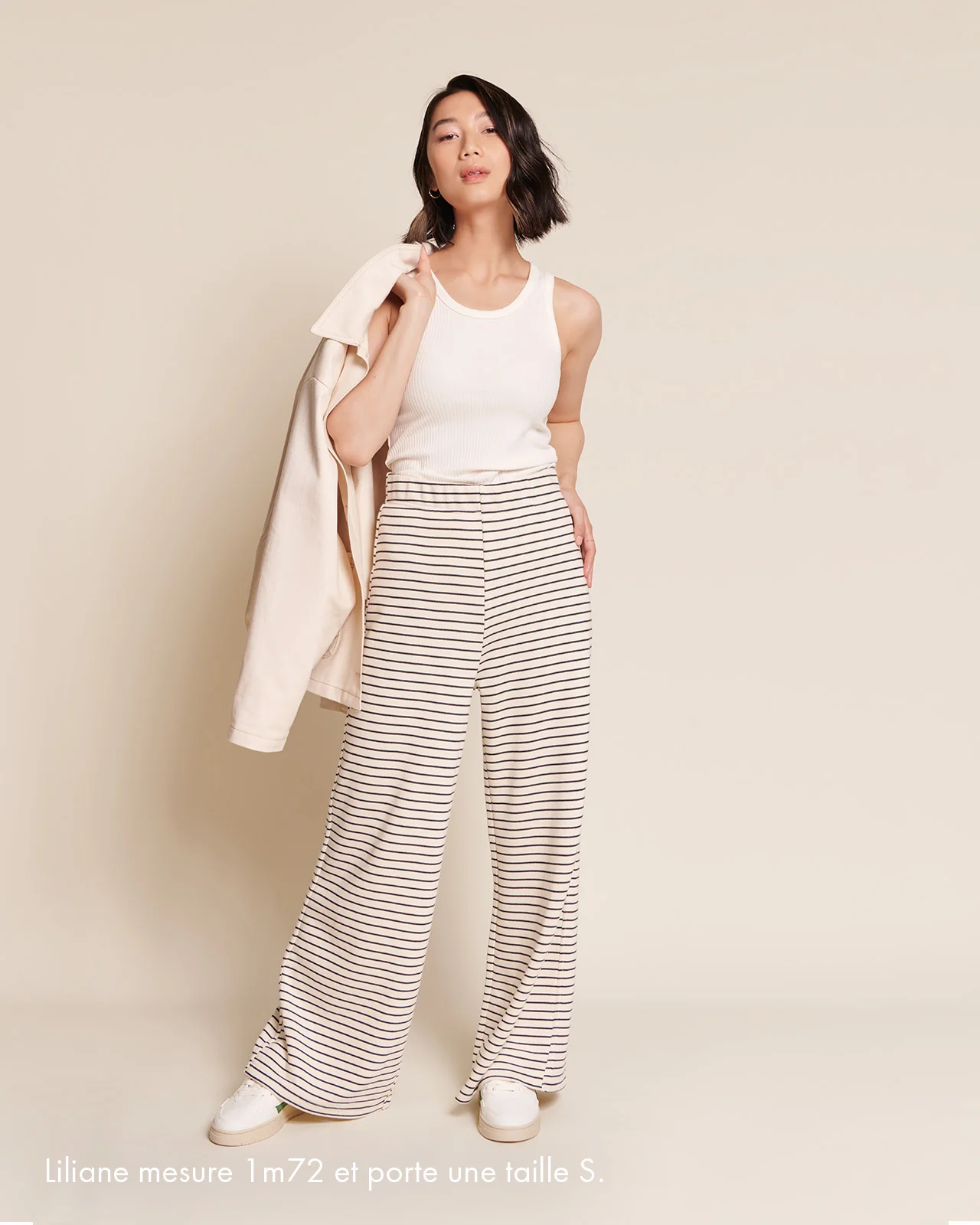 – Pauline, c’est notre coupe de pantalon iconique : taille haute, jambe droite et large. Le pantalon le plus cool et réconfortant de votre vestiaire.
