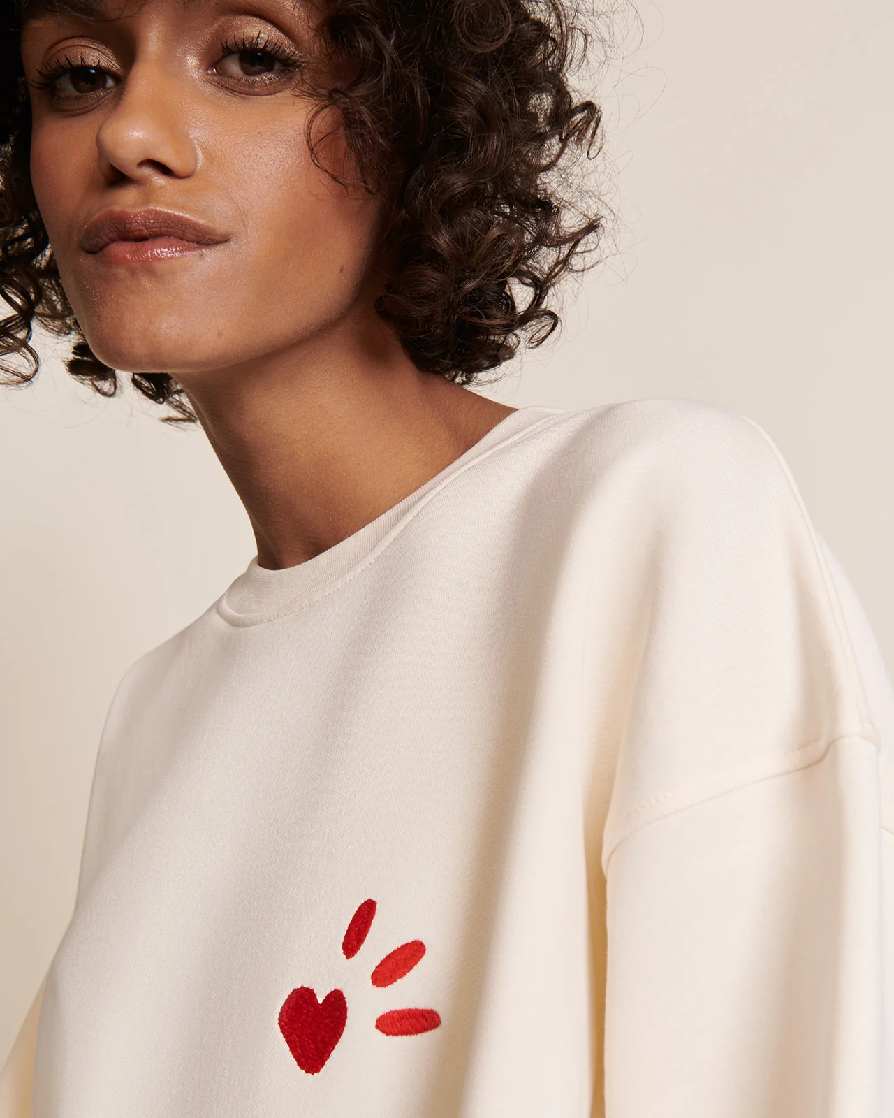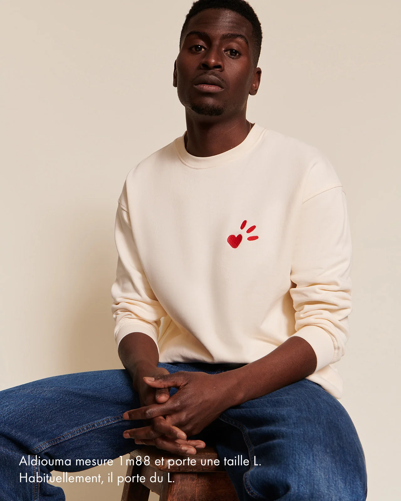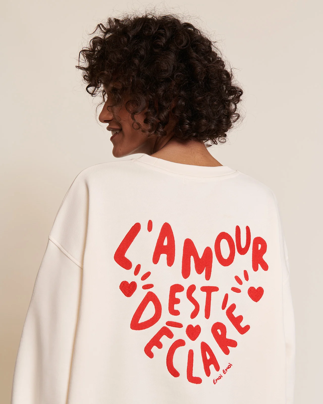 Le sweat qui voit l’amour en grand : une coupe oversize, unisexe, portée plus ajustée si vous choisissez une taille en-dessous.