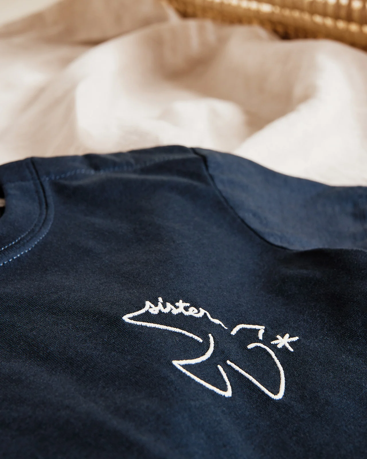 – Belle broderie signature « Sister bird », positionnée sur le coeur.