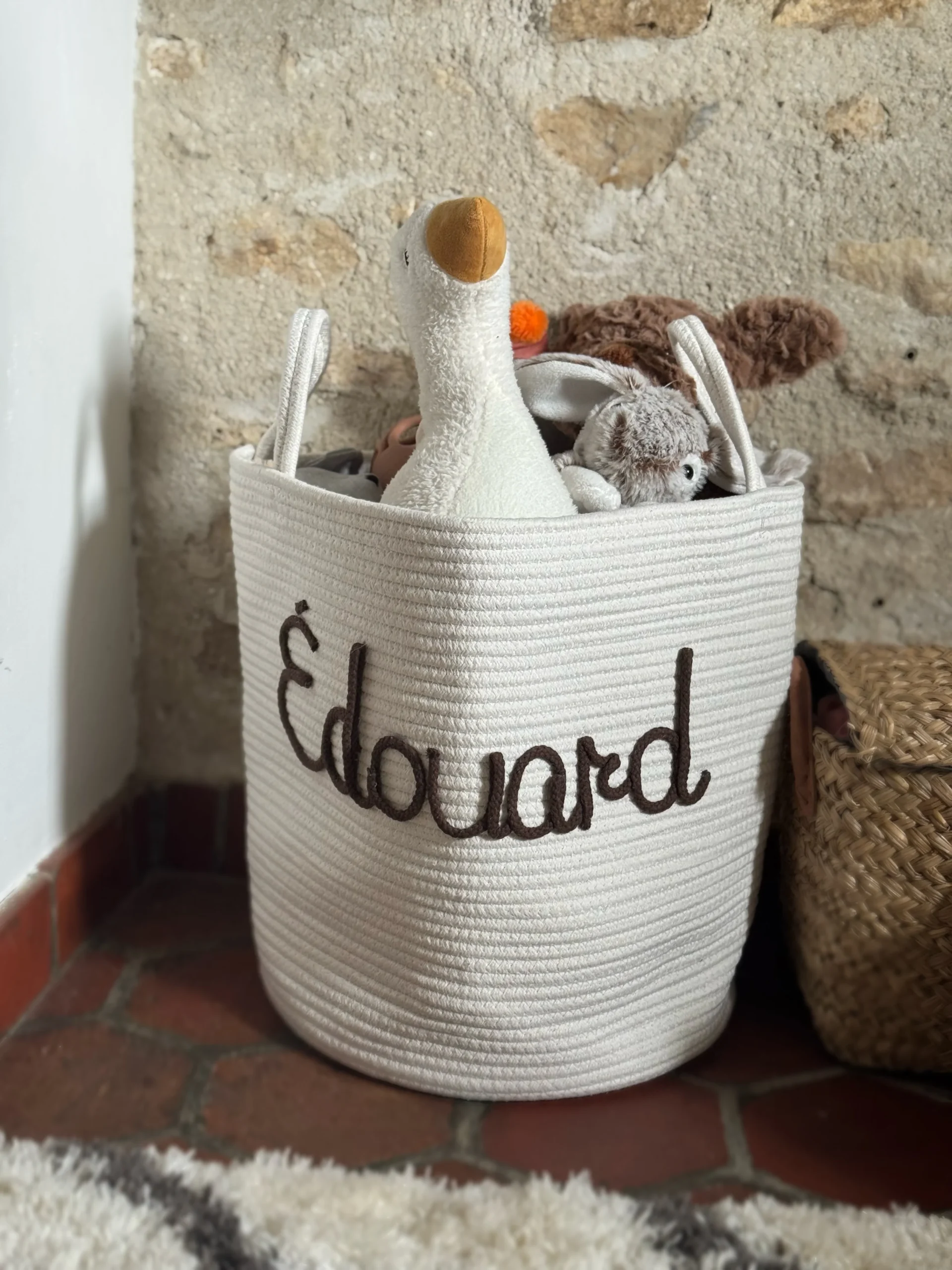 Pratique, solide et personnalisable, MAHÉ est le panier qu’on adore avoir à la maison. Fabriqué en tissu et corde, il est brodé au prénom (jusqu’à 12 caractères) avec une jolie écriture en tricotin.