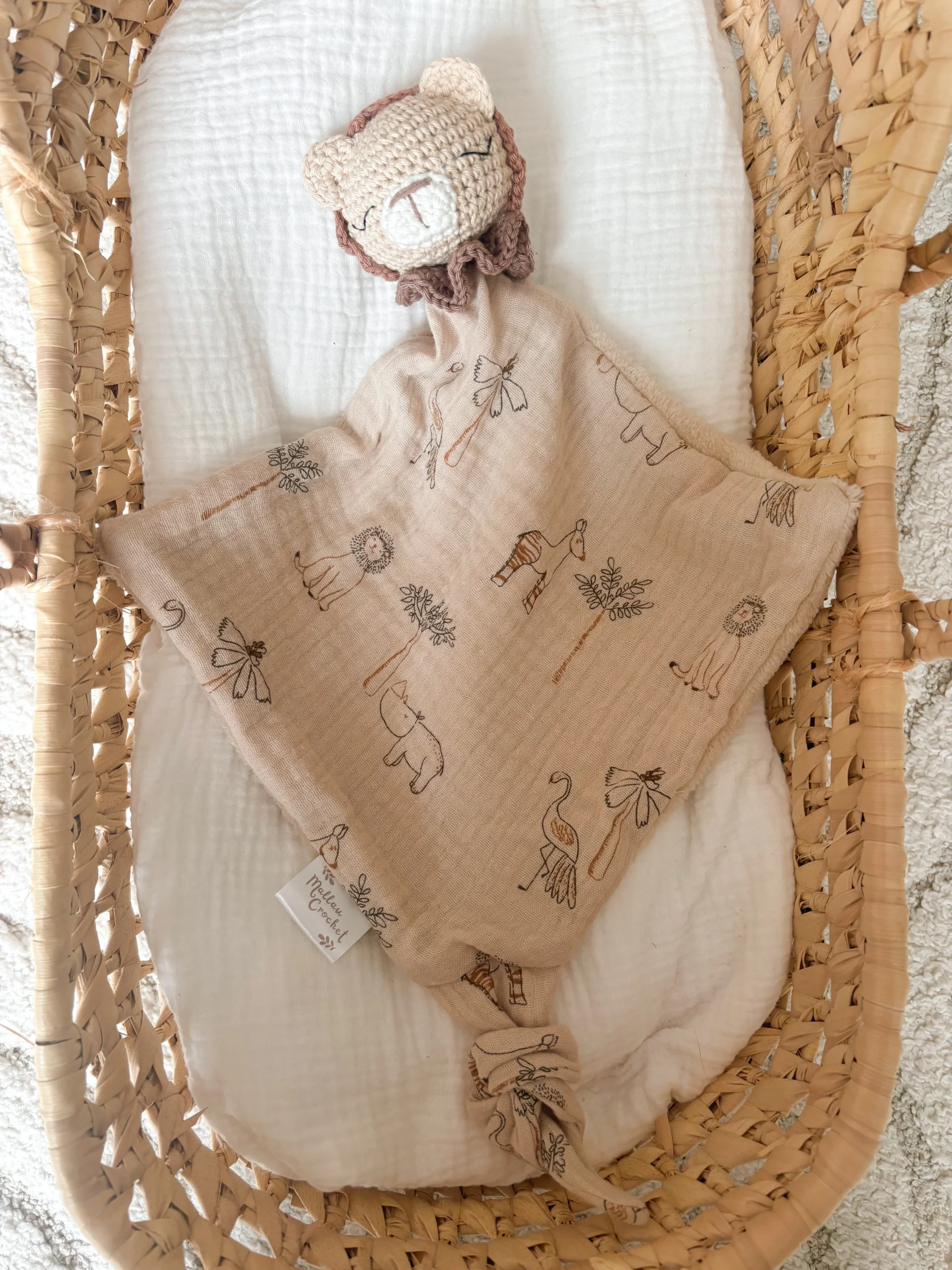 Doudou personnalisable avec une tête lion réalisée au crochet.