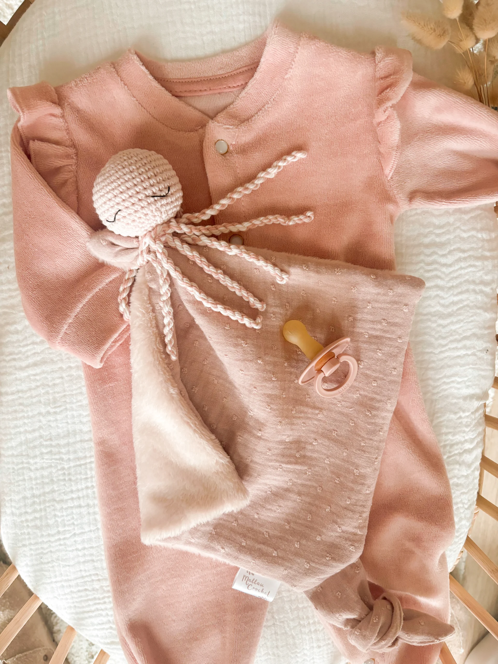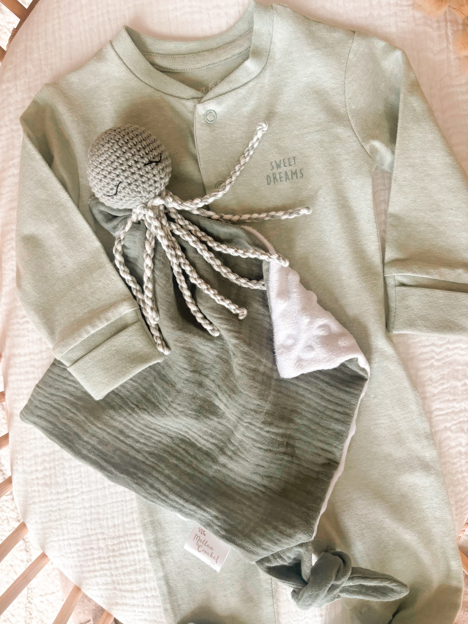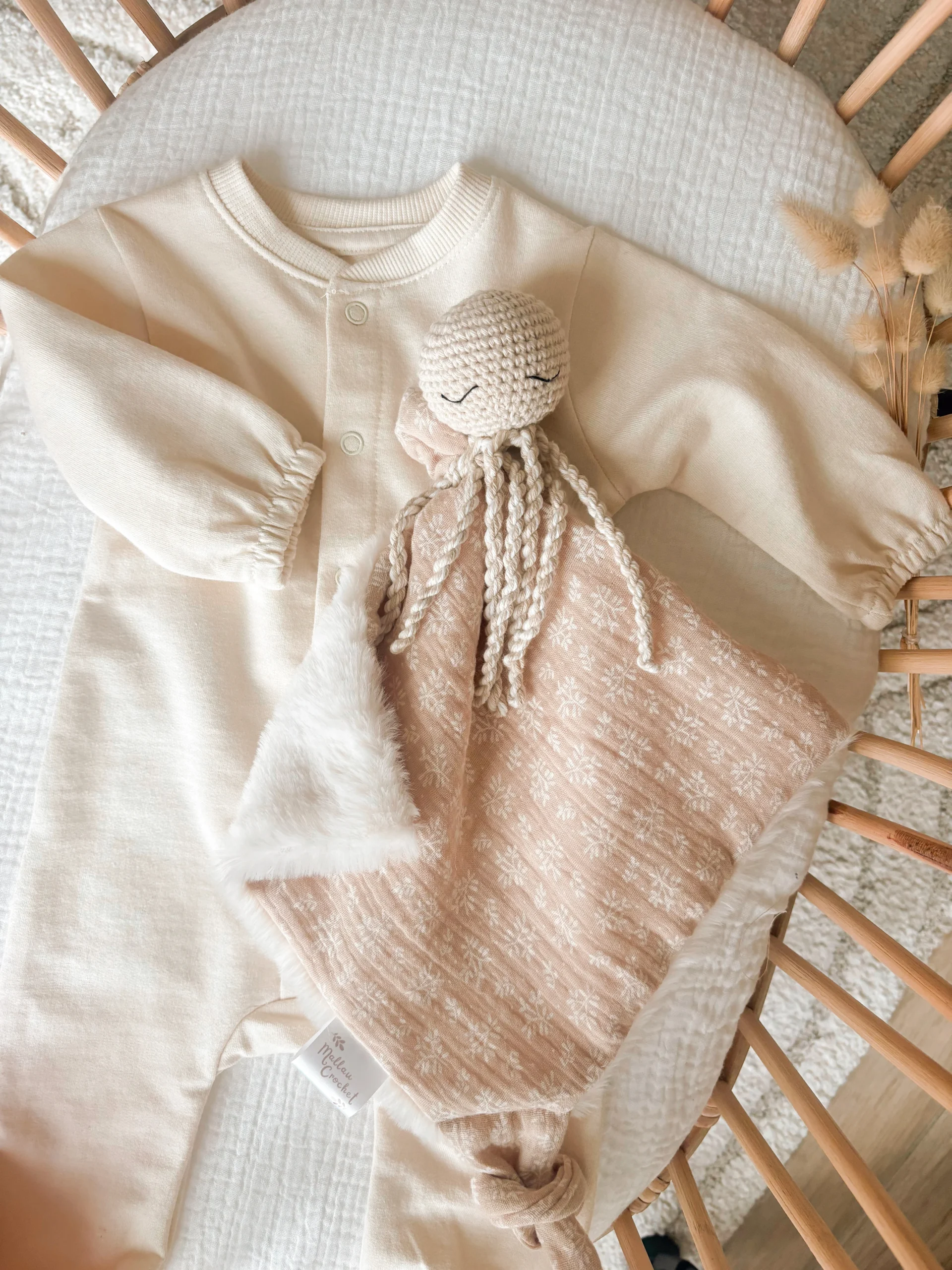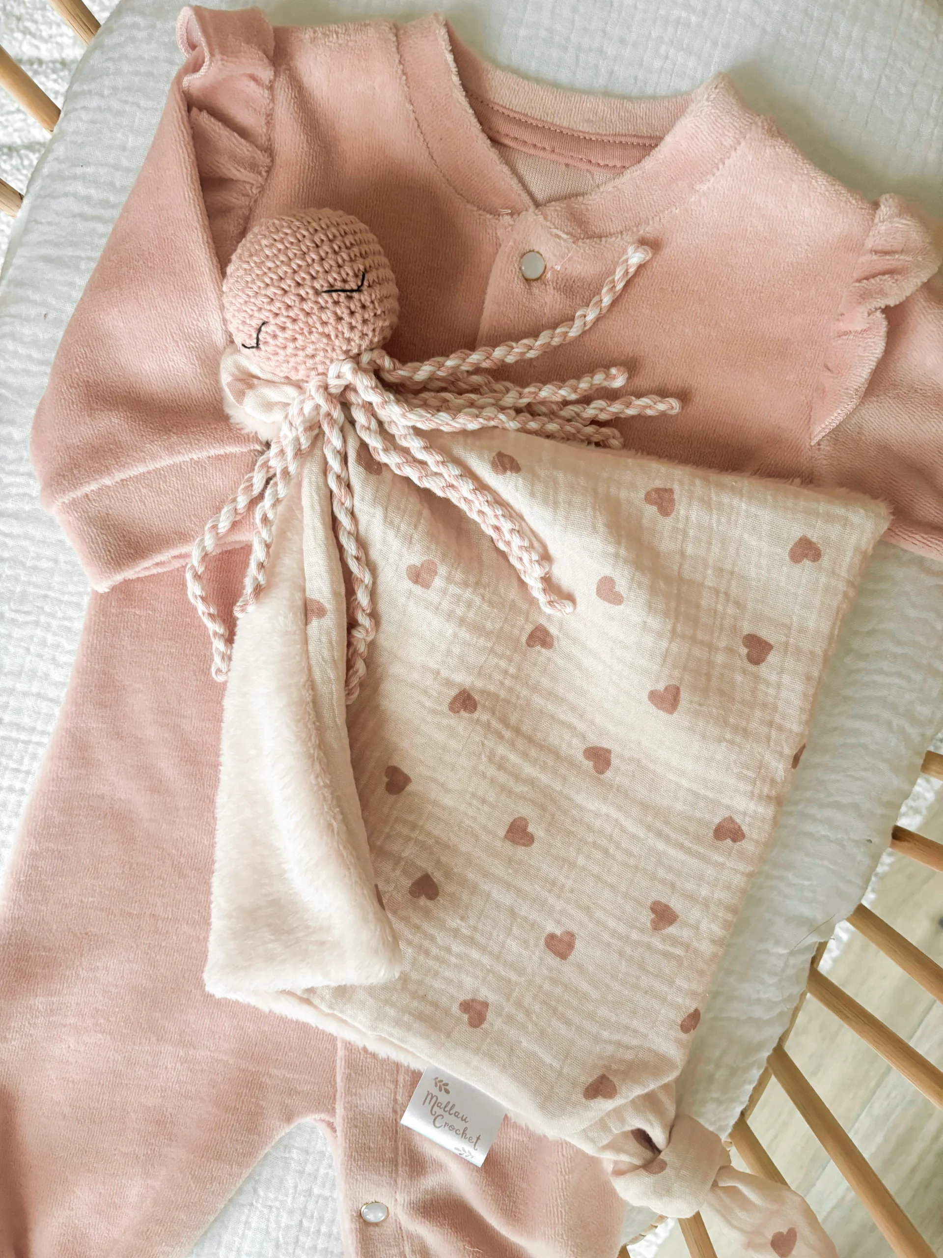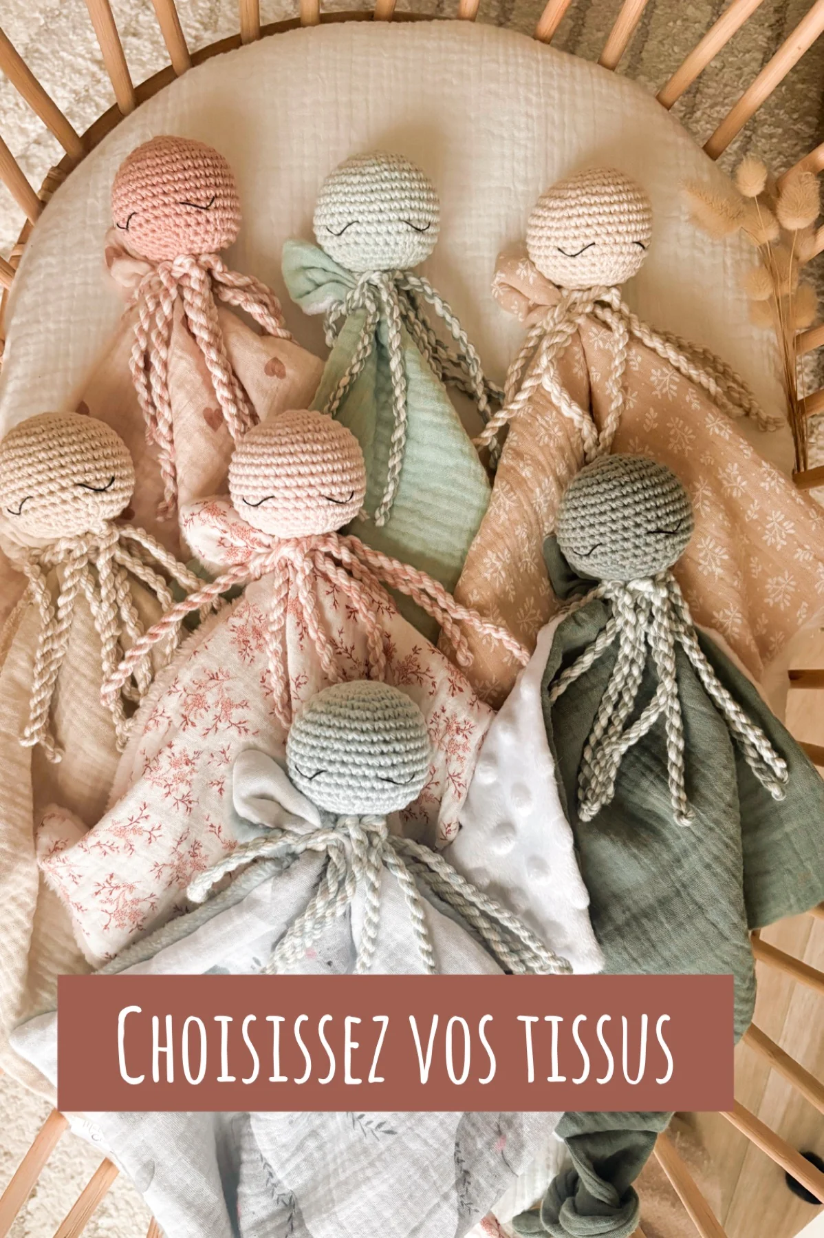 Doudou lange pieuvre personnalisé au crochet Mignon doudou avec une pieuvre réalisée à la main au crochet.Bébé adorera papouiller son doudou et mâchouiller le nœud cousu à l’extrémité du doudou.Un doudou tout doux pour bébé grâce au double gaze de coton et son envers en éponge de bambou . Les yeux sont brodés sur le […]