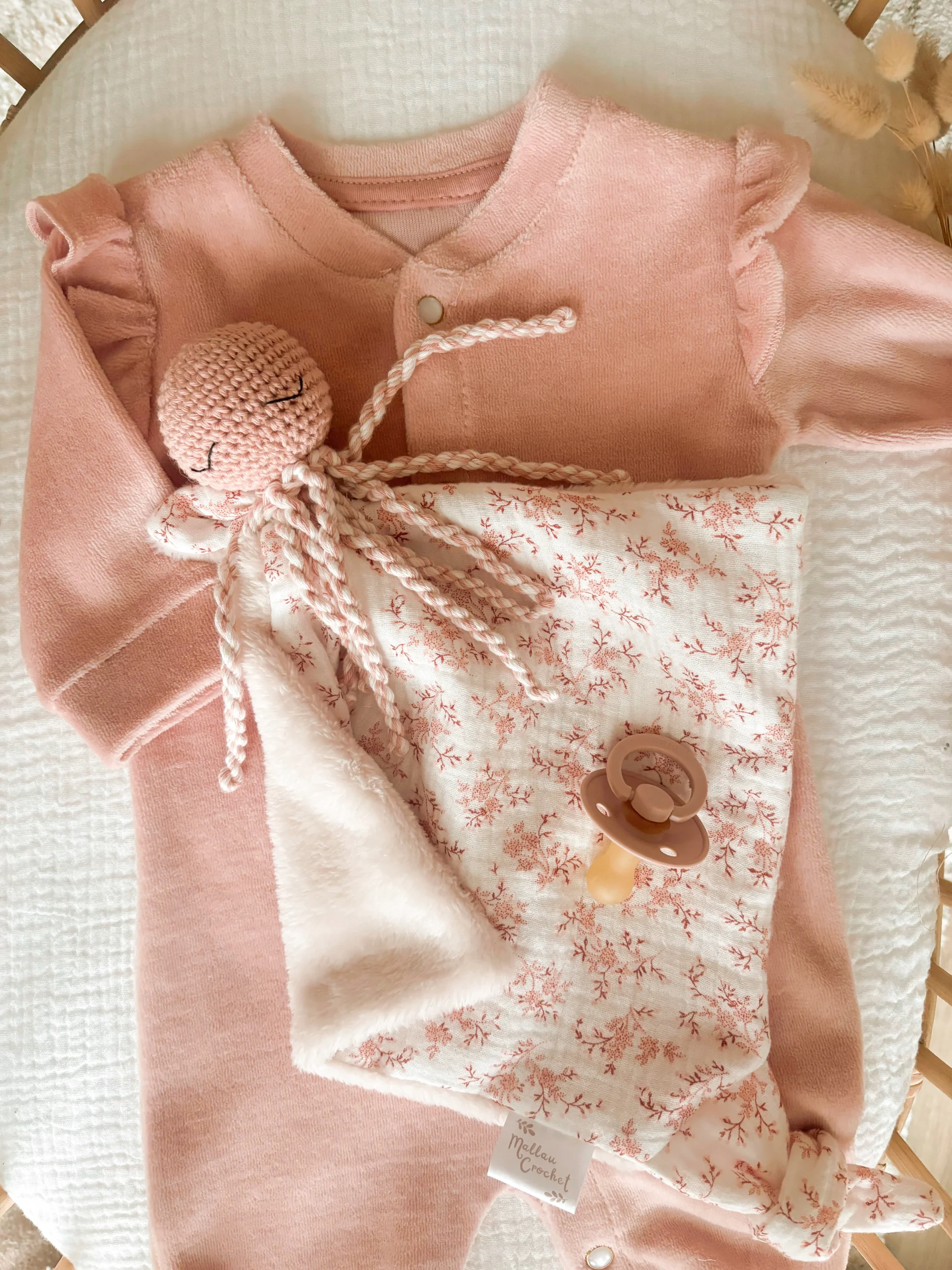 Bébé adorera papouiller son doudou et mâchouiller le nœud cousu à l’extrémité du doudou.