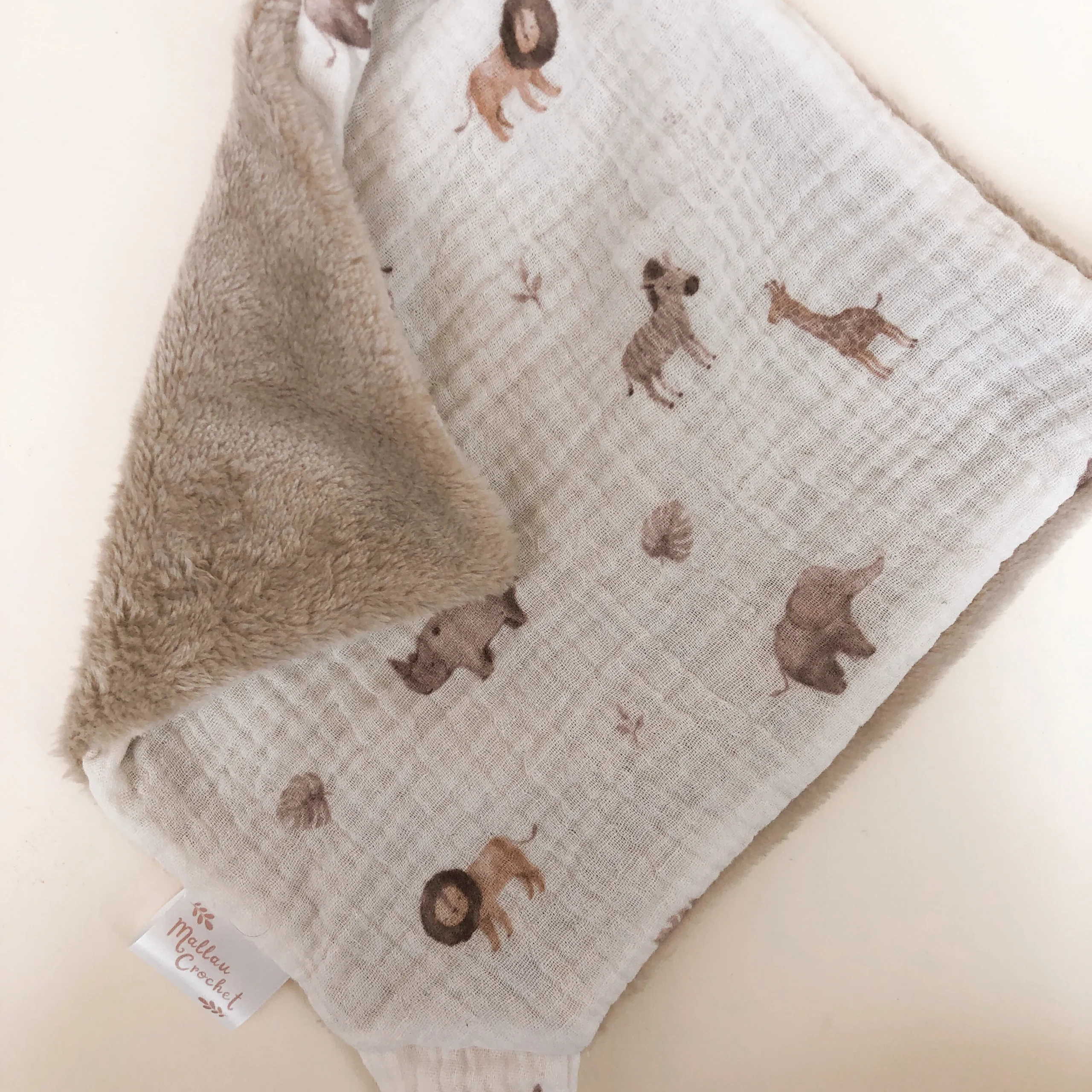 Doudou Safari personnalisé au crochet avec prénom de bébé Doudou personnalisable avec une tête d’éléphant ou de lion réalisée au crochet. Bébé adorera papouiller son doudou et mâchouiller le nœud cousu à l’extrémité du doudou.Un doudou tout doux pour bébé grâce au double gaze de coton et son envers en tissu doudou . Les yeux […]