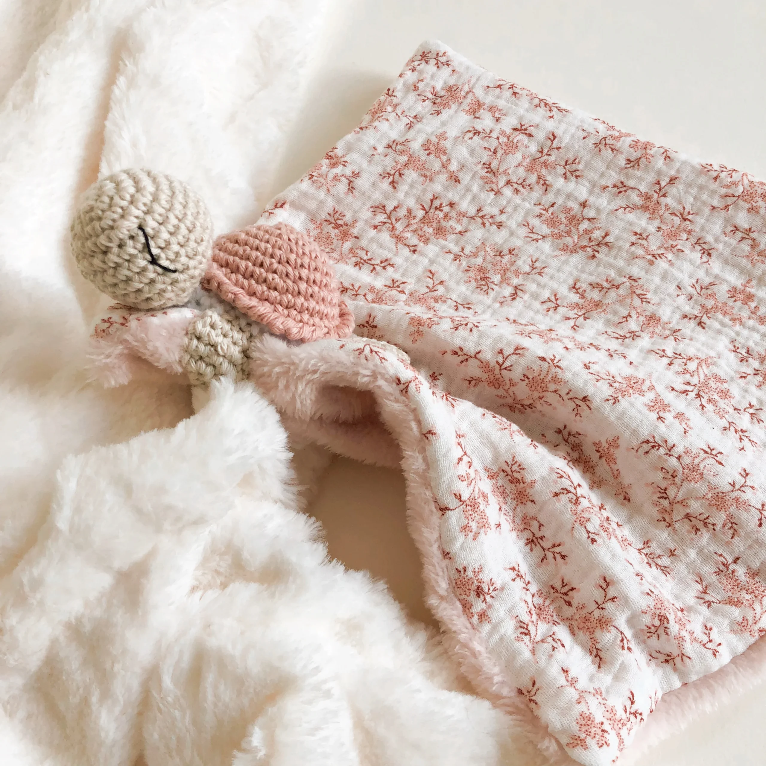 Un doudou tout doux pour bébé grâce au double gaze de coton et son envers en tissu doudou .