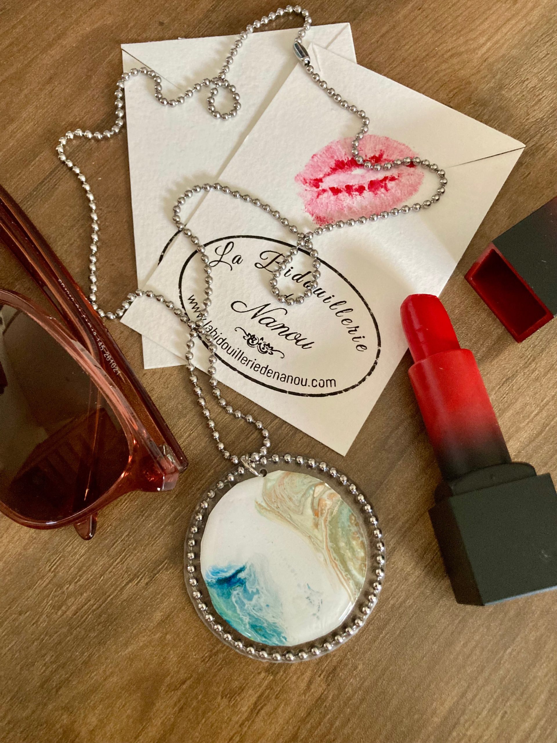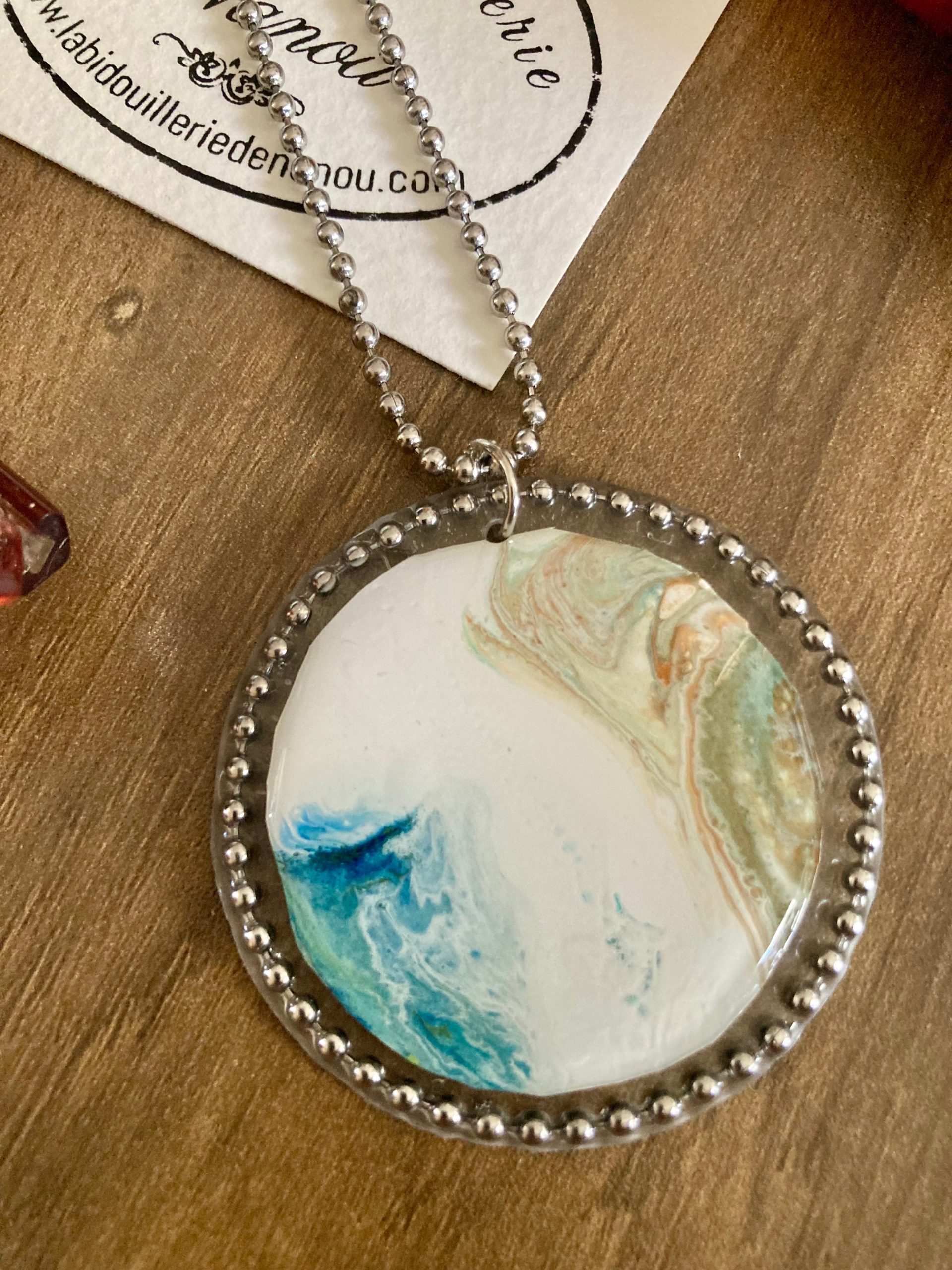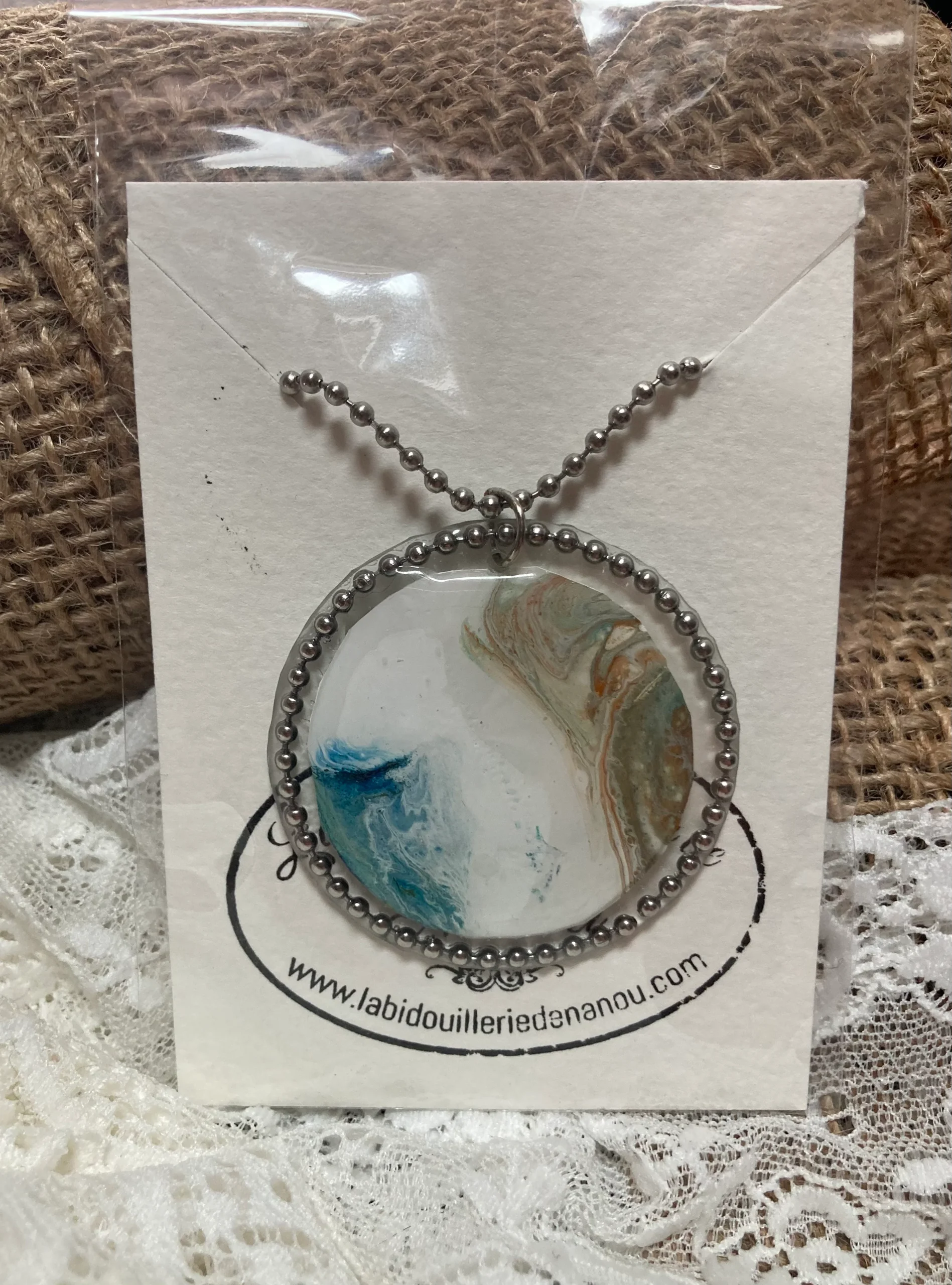 Pendentif en résine et acrylique. Chaîne avec fermoir.