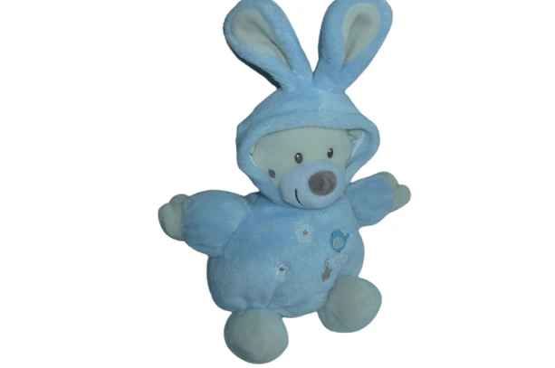Avec son déguisement tout doux en forme de lapin et ses jolis motifs étoilés et lunaires, cet adorable ours bleu signé Auchan invite à la rêverie. Parfait pour bercer les tout-petits dans un univers paisible, il deviendra vite l’allié des nuits calmes et des instants de réconfort.